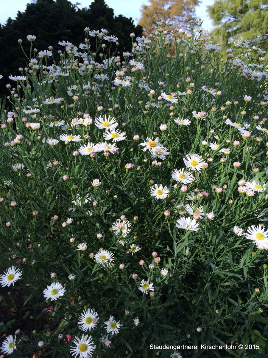 Weiße Asternblüten auf hohen stabilen Trieben mit lanzettlichen, blaugrünen Blättern. Stattliche Staude der Prärie. Sehr dekorativ und wertvoll.
