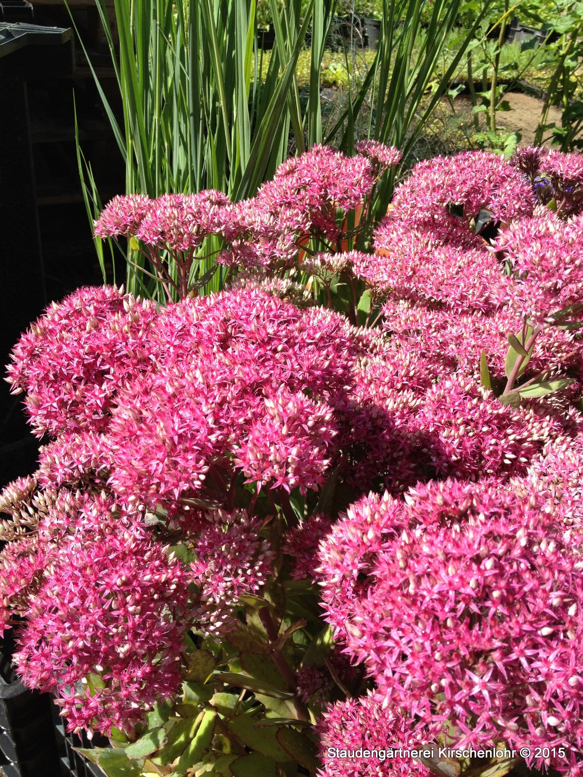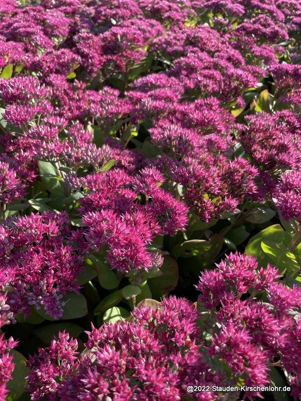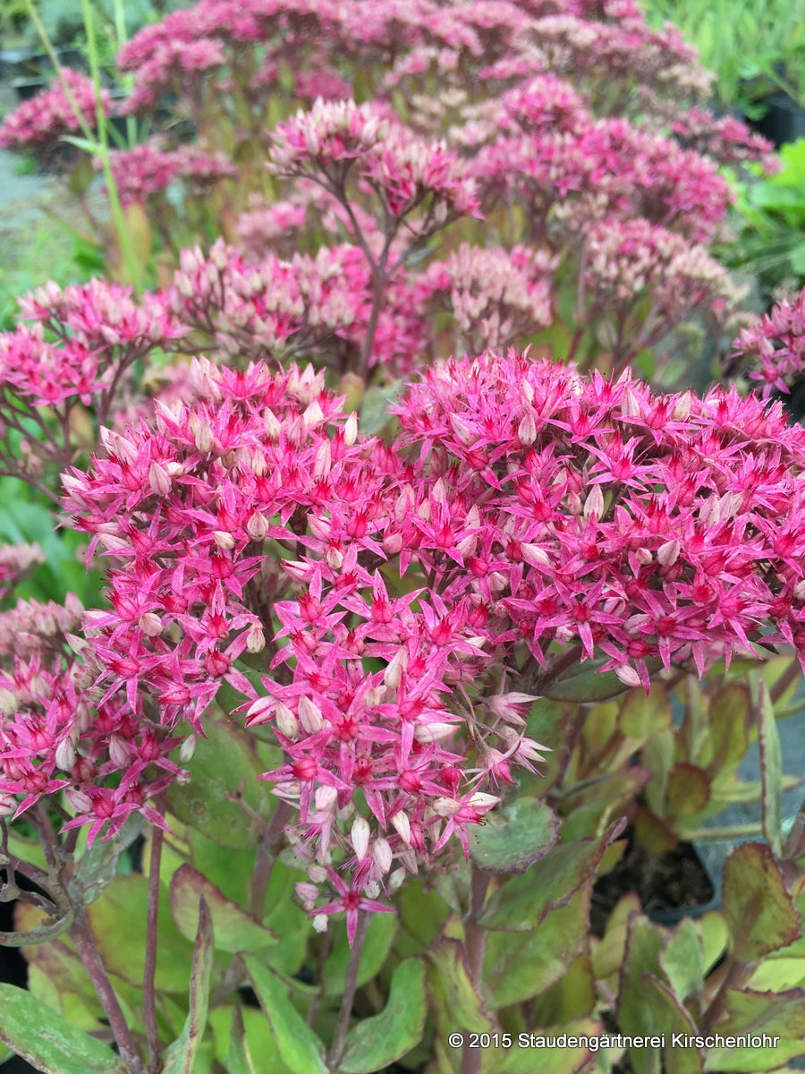 Sternförmige, tief karminrosa Blüten auf lockeren Scheindolden. Saftiges grünes, ovales, sukkulentes Laub. Sommergün. Hervorragende, farbprächtige Selektion. Gewinner der RHS Award of Garden Merit. syn. Sedum