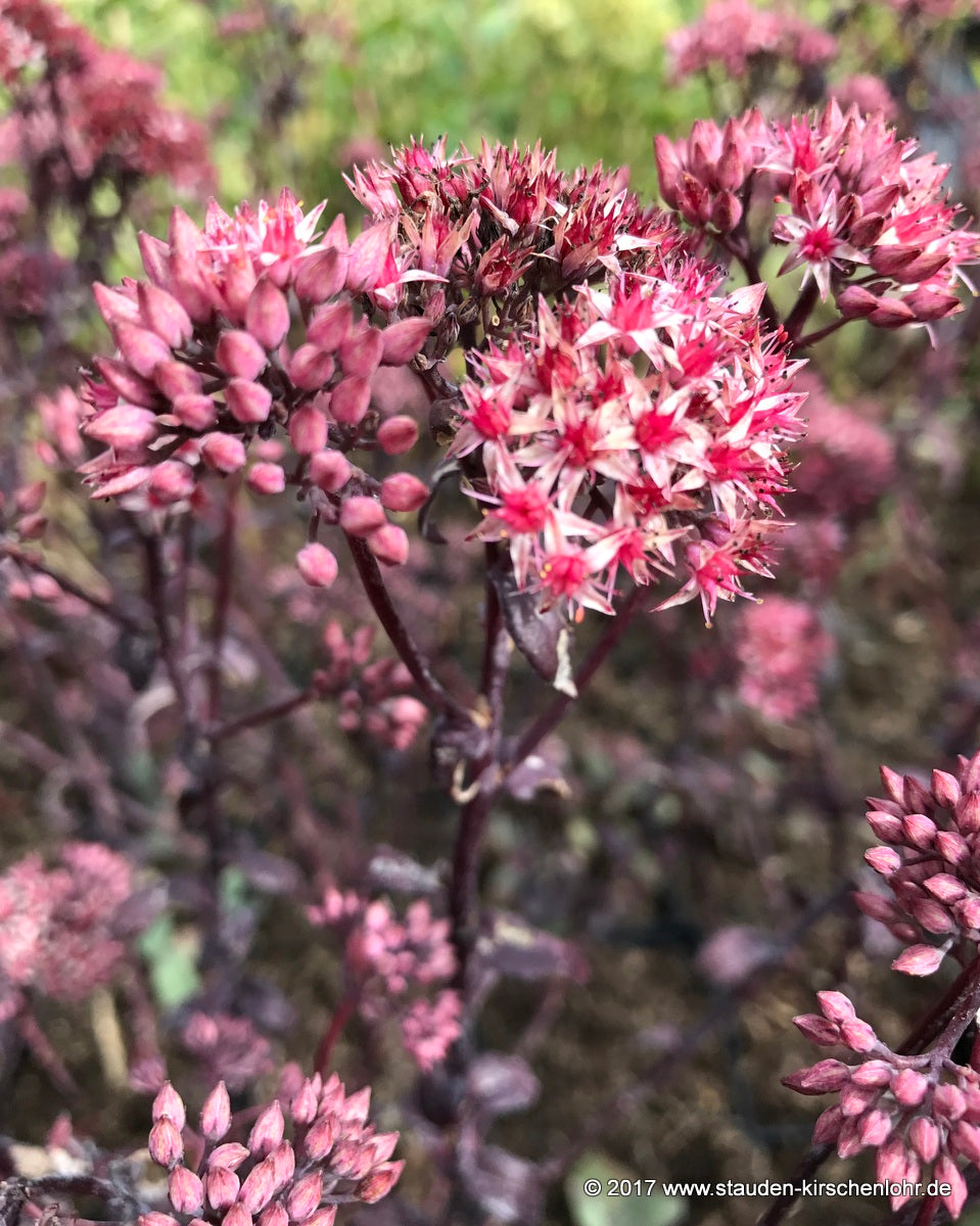 Hellrosa Sternblütchen mit rötlichem Zentrum stehen in aufrechten Scheindolden. Purpurgraue, eiförmige Blätter mit gezahntem Blattrand. Sommergrün. syn. Sedum