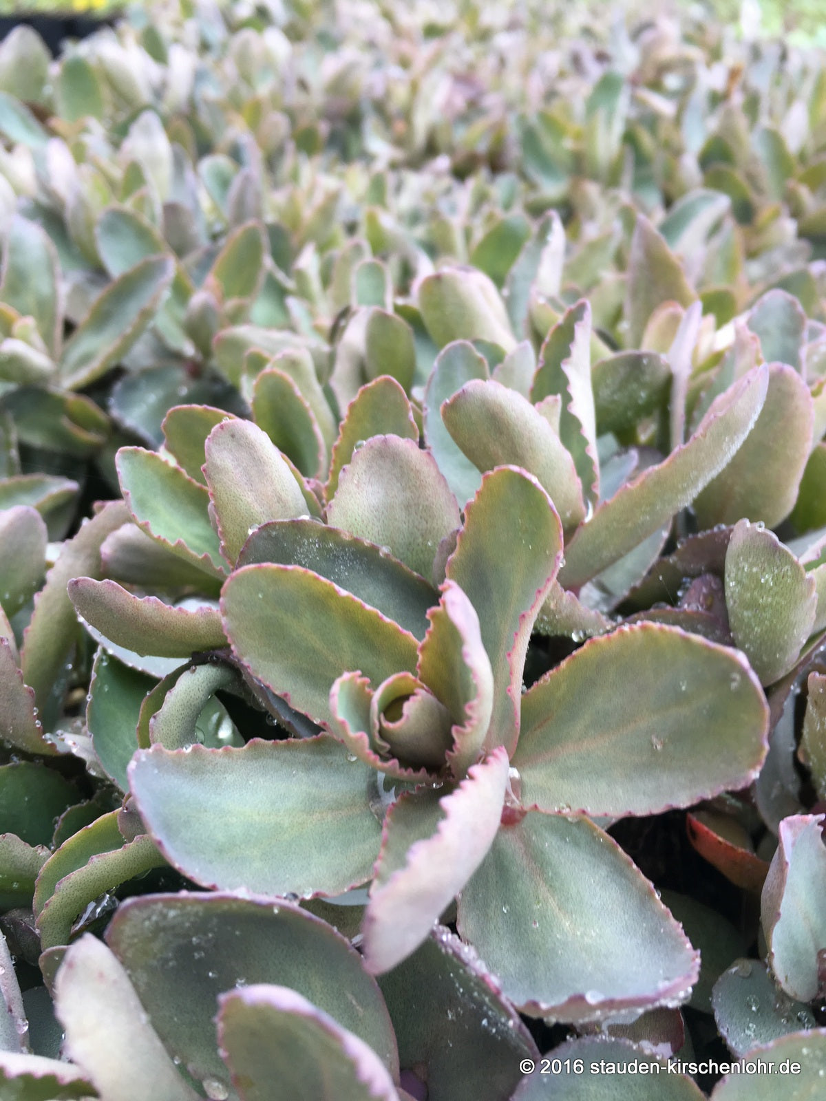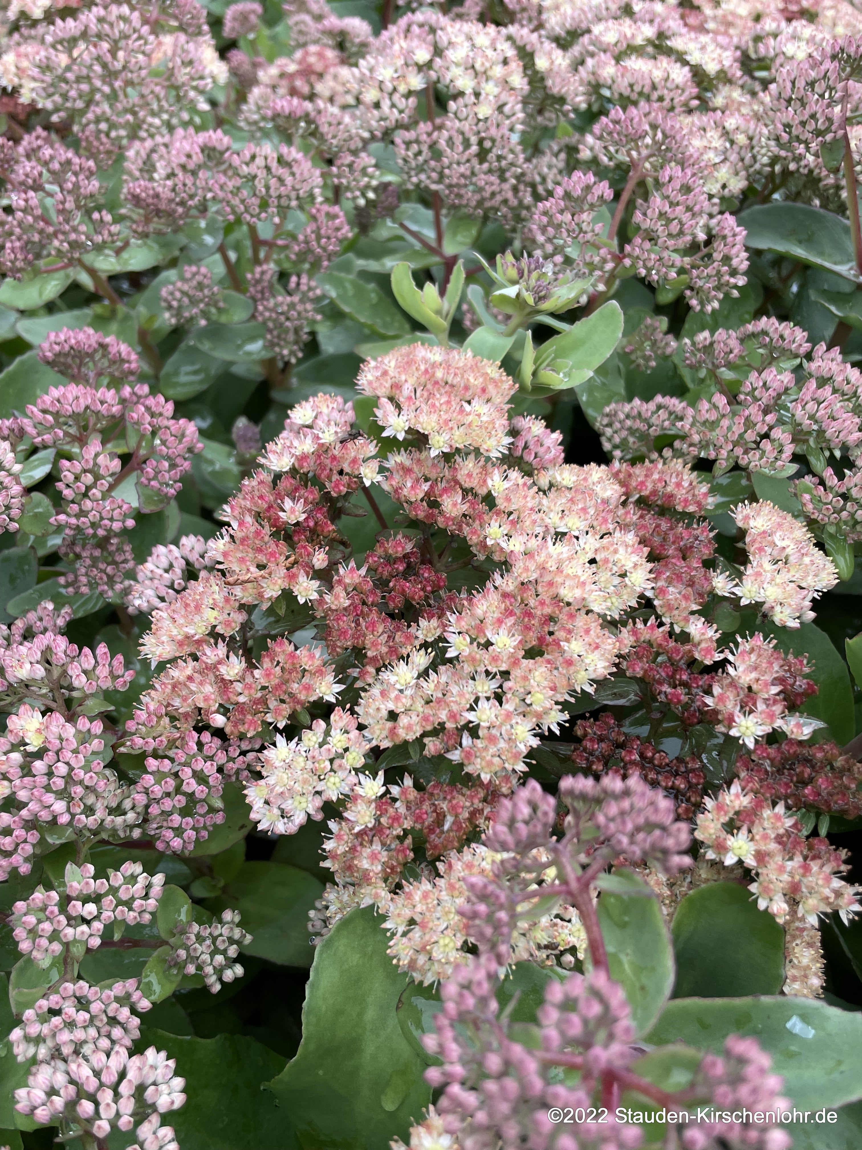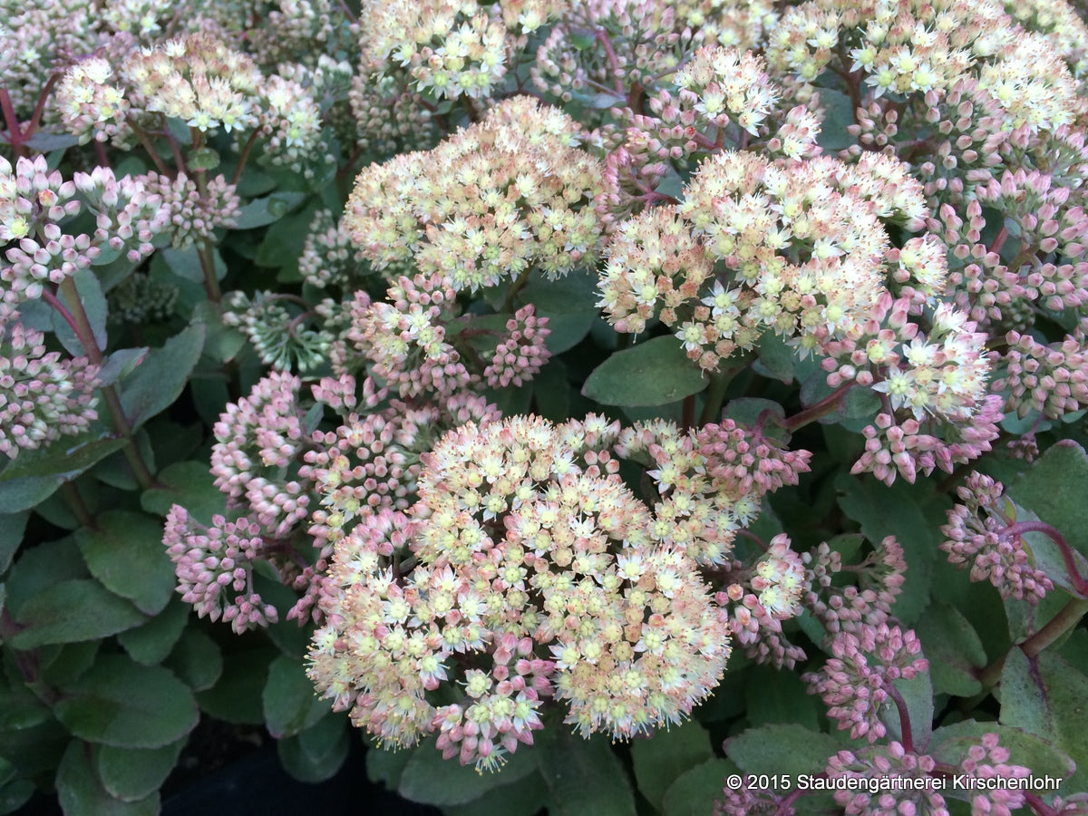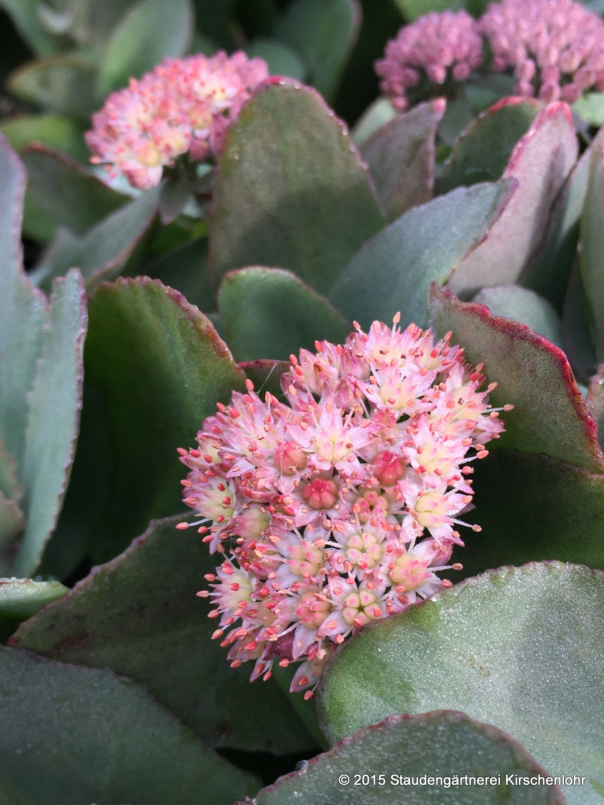 Aus rosa Blütenknospen öffnen sich schwefelgelbe, sternförmige Blütchen. Faszinierender Kontrast zu den gräulich-purpurgetönten, ovalen, sukkulenten Laub. Sommergün. syn. Sedum