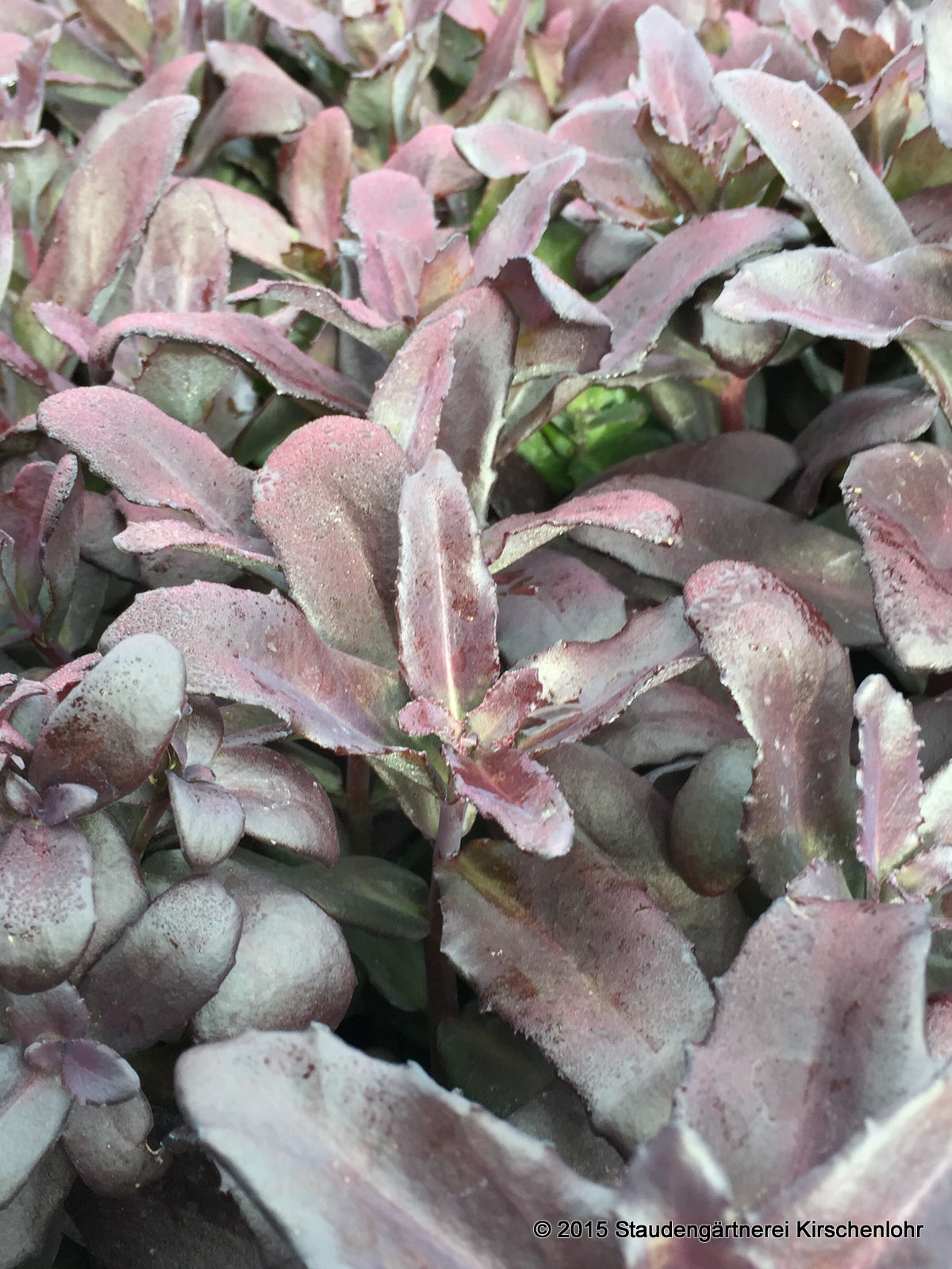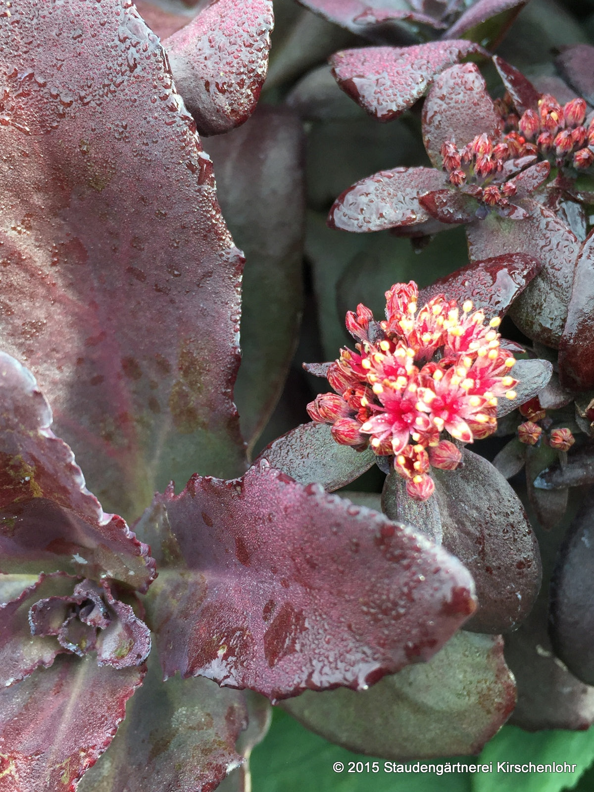Sternförmige, karminrote Blüten in kleinen Scheindolden. Sukkulente, ovale, auberginenfarbene Blätter. Straff aufrechter Wuchs. Sommergrün. syn. Sedum