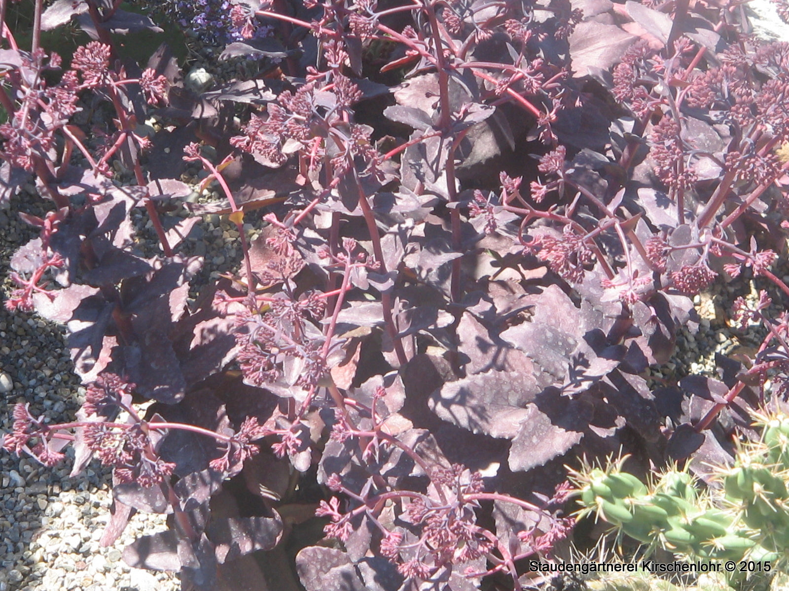 Sternförmige, lachsrosa Blüten in kleinen Scheindolden. Sukkulente, ovale, tief purpurfarbene Blätter. Im Austrieb sind die Blätter matt. Lockeres Wuchsbild. Sommergrün. syn. Sedum