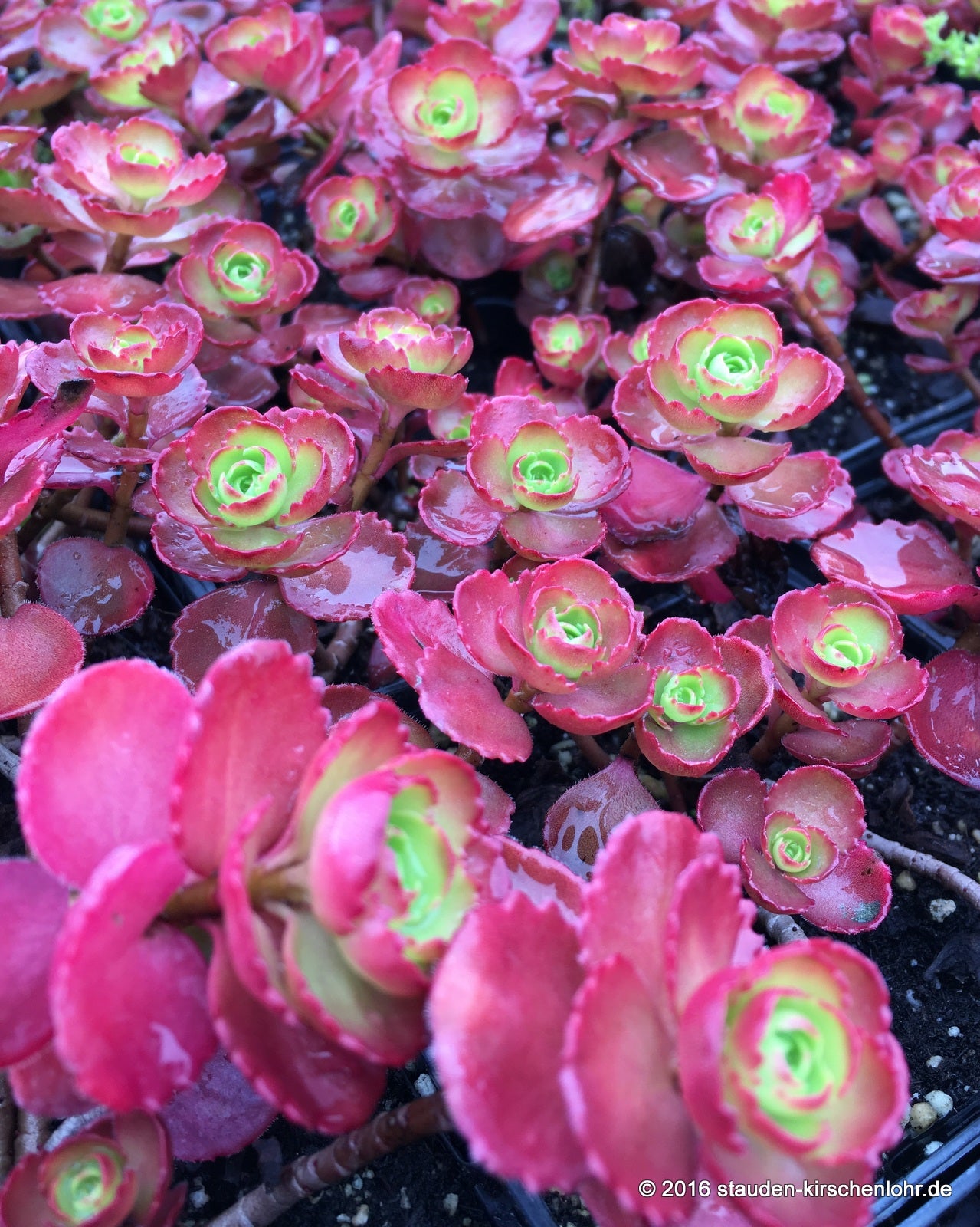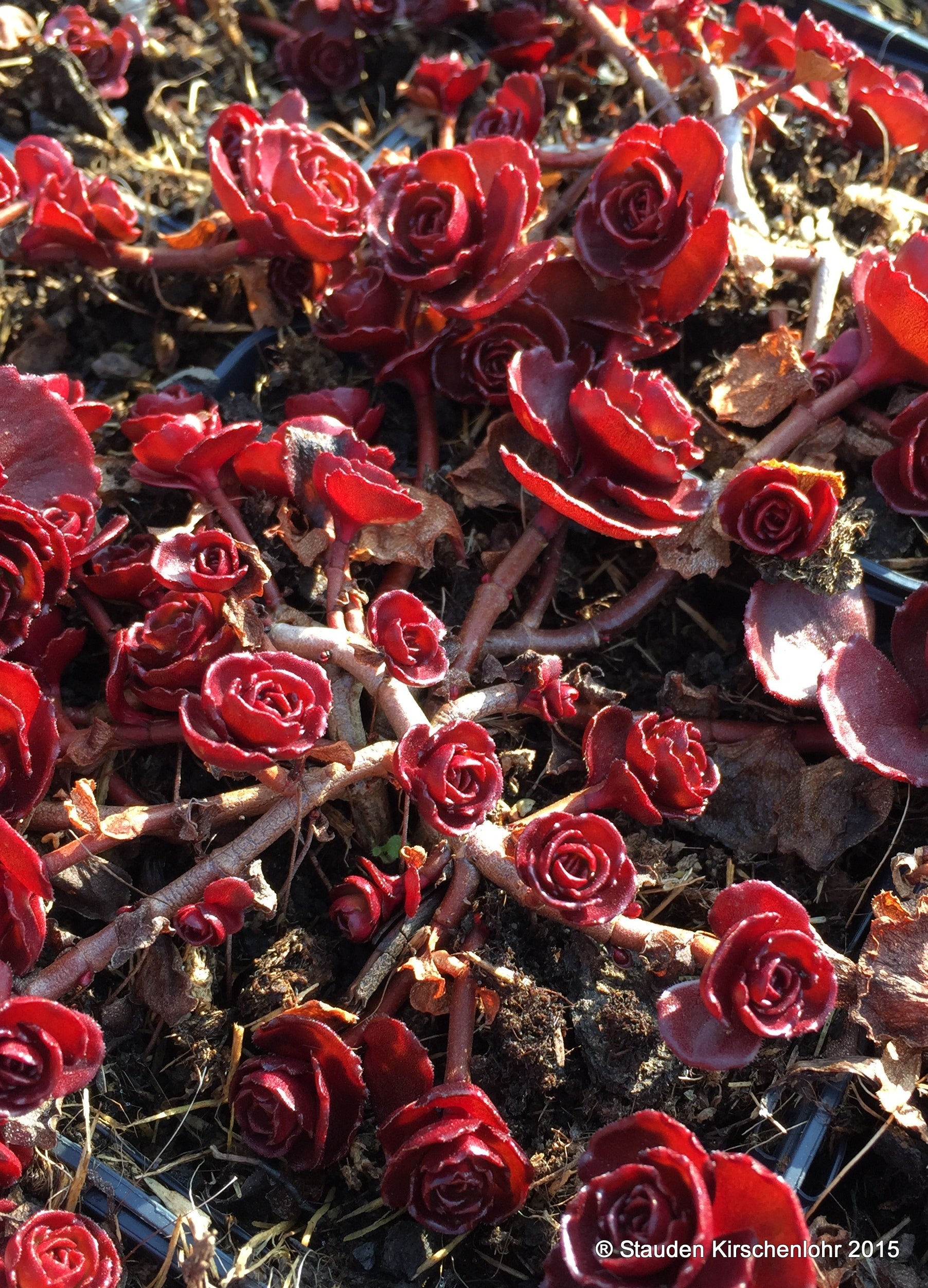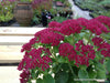 Fantstische Selektion aus 'Herbstfreude'. Große, flach gewölbte Scheindolden mit sternförmigen, himbeerroten bis braunroten Blüten. Sukkulente, eiförmig Blätter. syn. Sedum