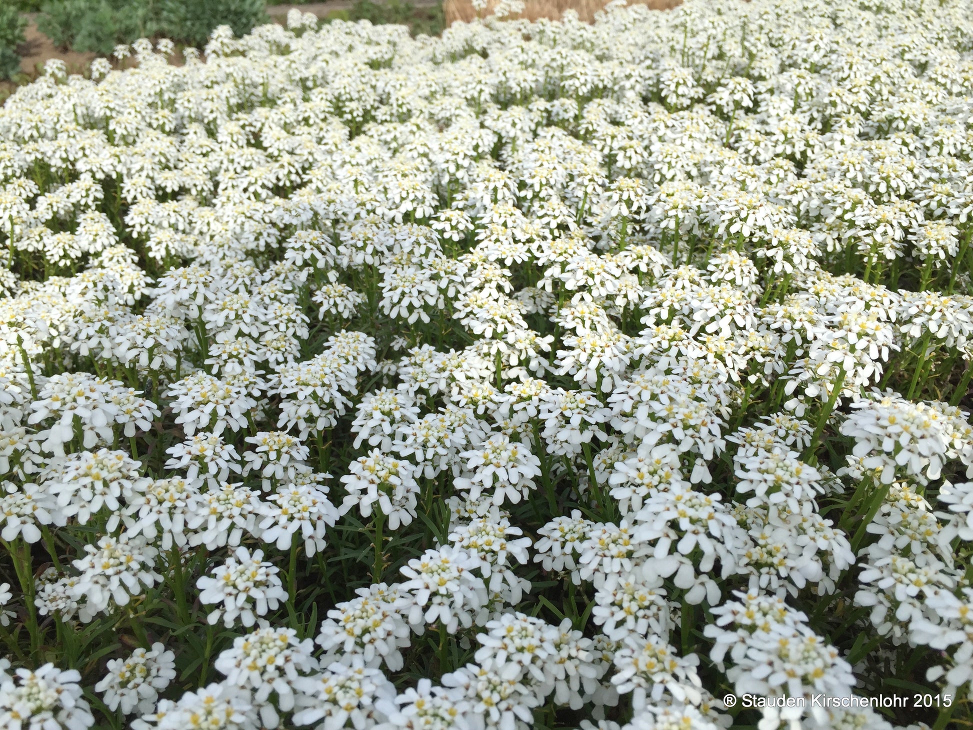 Weiße Blütchen doldig bis doldentraubig angeordnet. Lineale bis spatelförmige, sattgrüne Blätter. Immergrün. Sehr dichter, kompakter Wuchs.