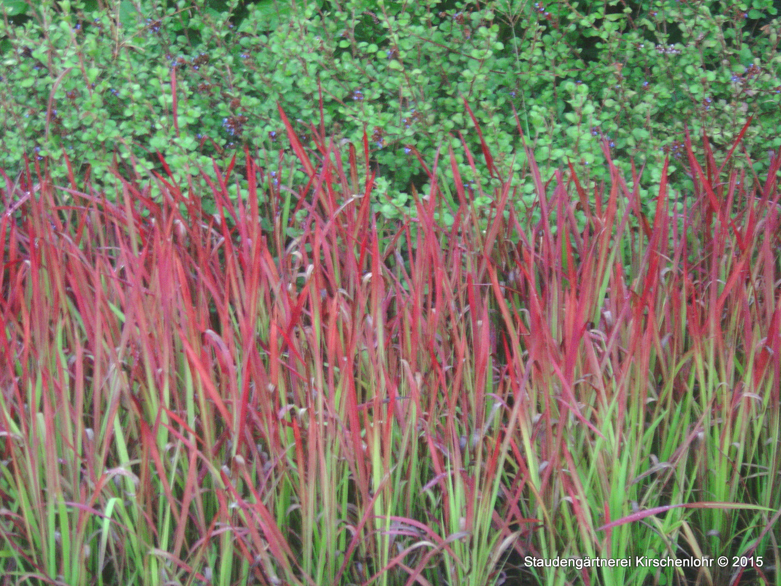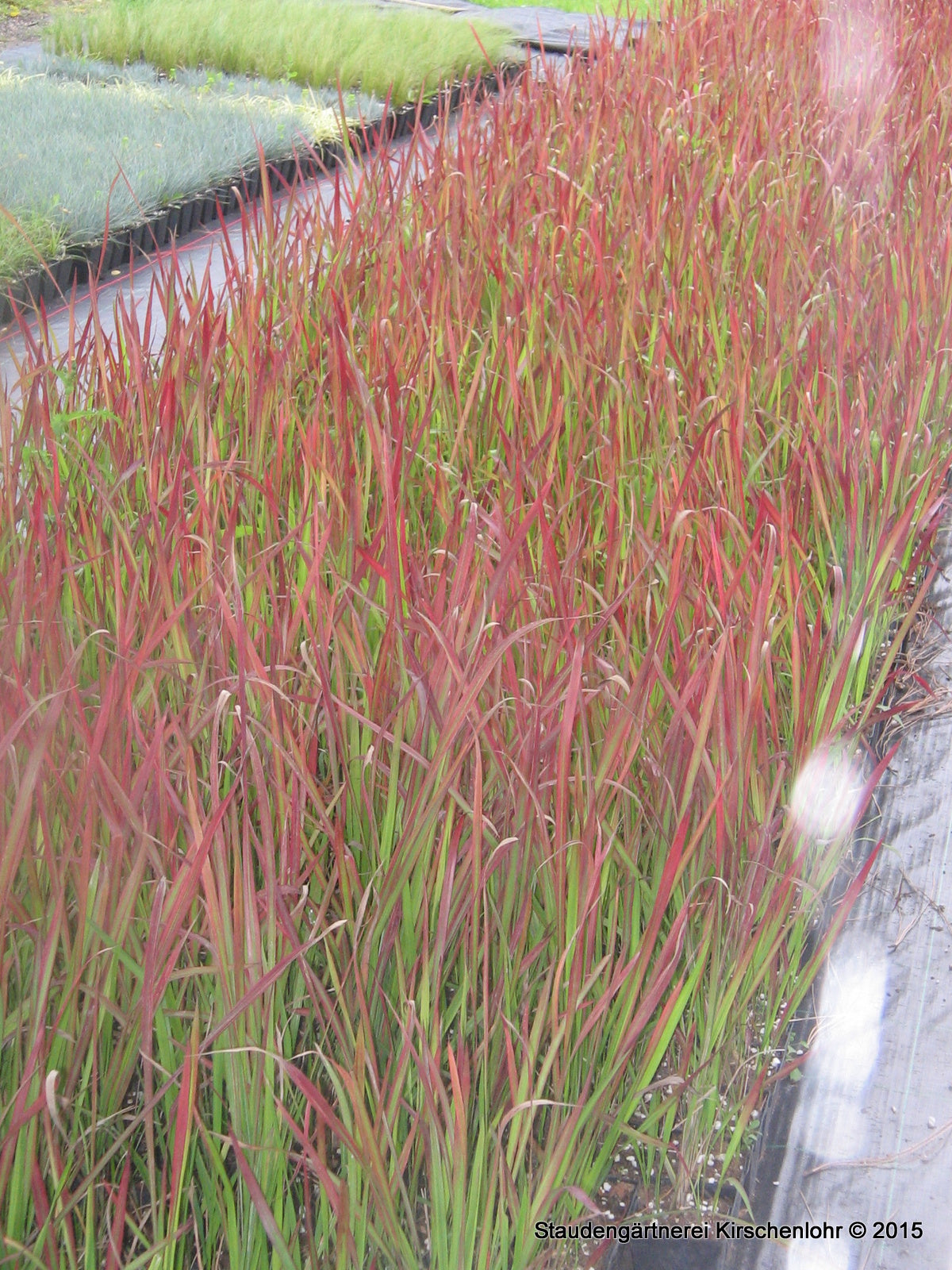 Bei uns nicht blühendes Gras. Riemenförmige; im Austrieb grüne, später auffällig granatrot gefärbte Blätter. Straff aufrechtes Wuchsbild. Leicht ausläufertreibend. Originalklon von Kurt Bluemel (USA)!