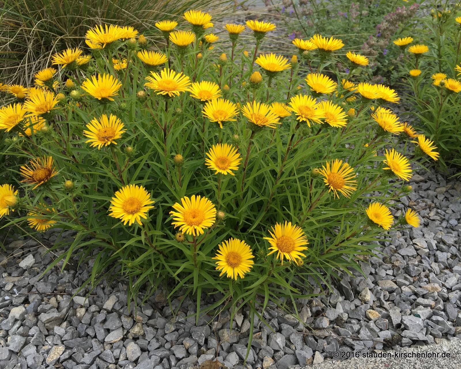 Endständige, goldgelbe Strahlenblüten mit gelbem Blütenboden. Aufrechte Triebe mit lineallanzettlichen, spitzen Blättern. Wertvolle, robuste Staude. Sommergrün.
