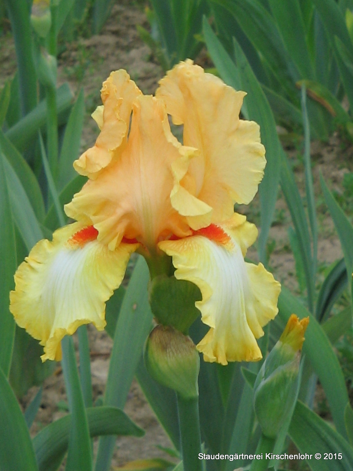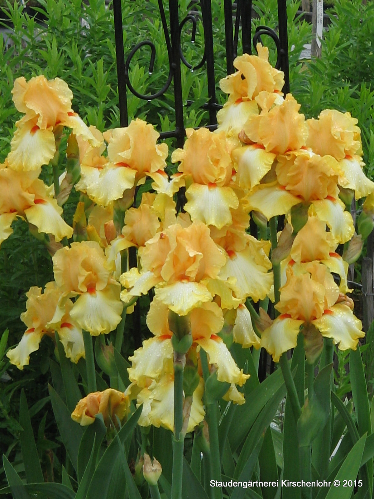 Domblätter hellorange, Hängeblätter heller mit cremefarbenem Spiegel. Dunkeloranger Bart. Gute Fernwirkung.