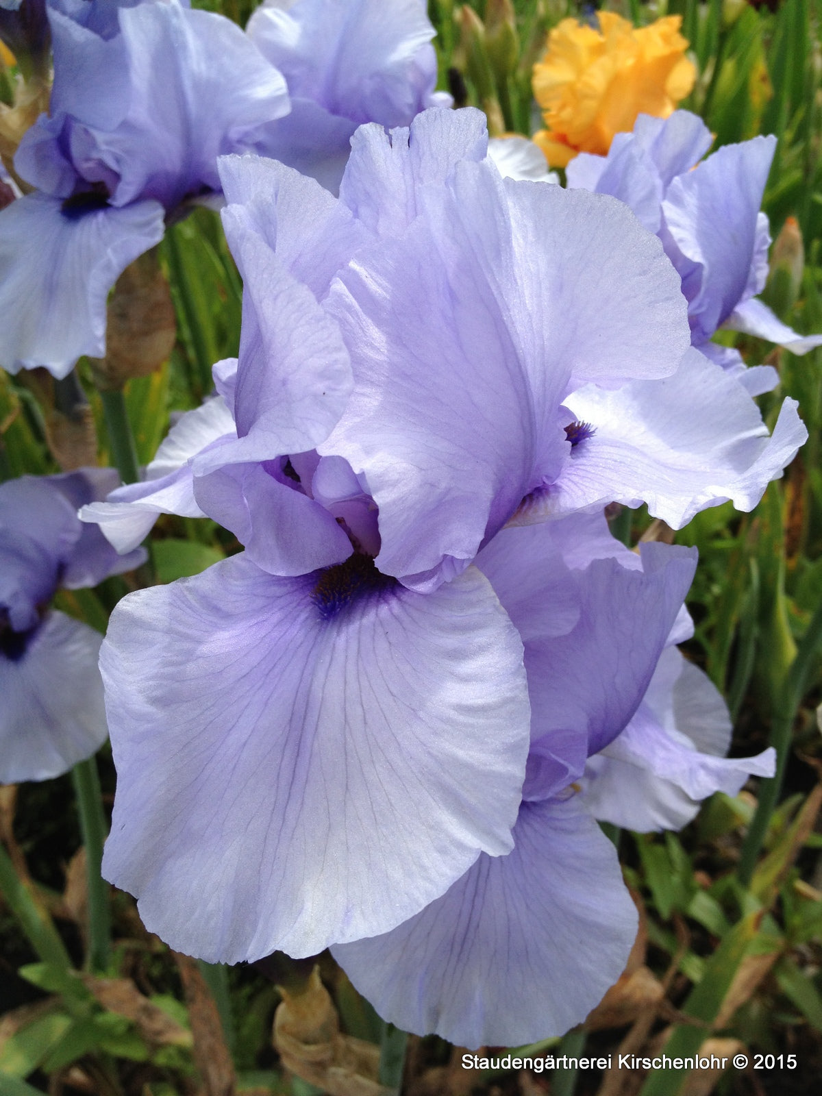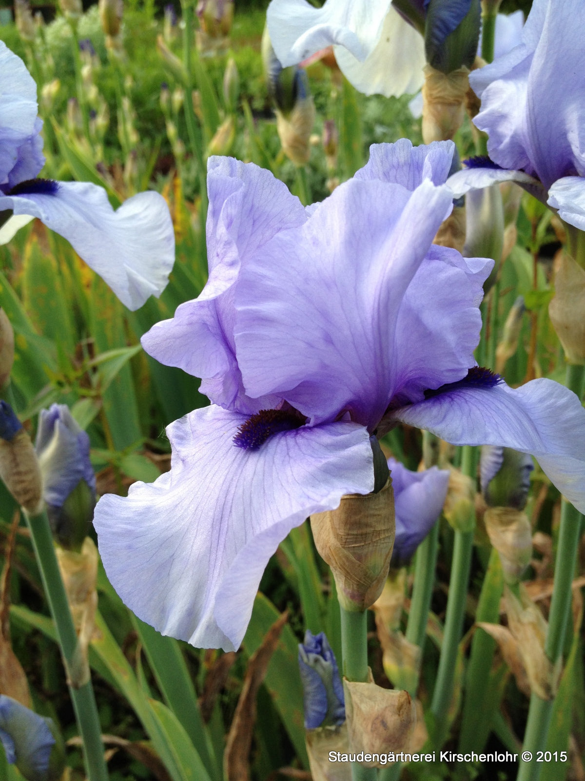 Hell- bis Mittelblau mit prächtigen, schwarzblauen Bärten. Reichblühende Sorte mit mittelgroßen Blüten.