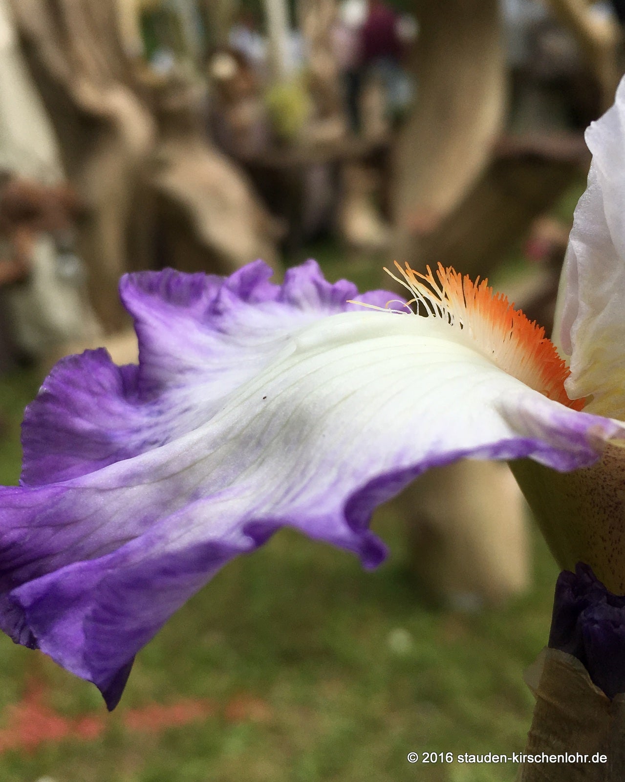 Reines Weiß mit schönem lavendelhellblauem Rand an den Sepalen. Diskrete rote Bärte. Elegante, mittelgroße Blüten, regelmäßig und enggewellt.
