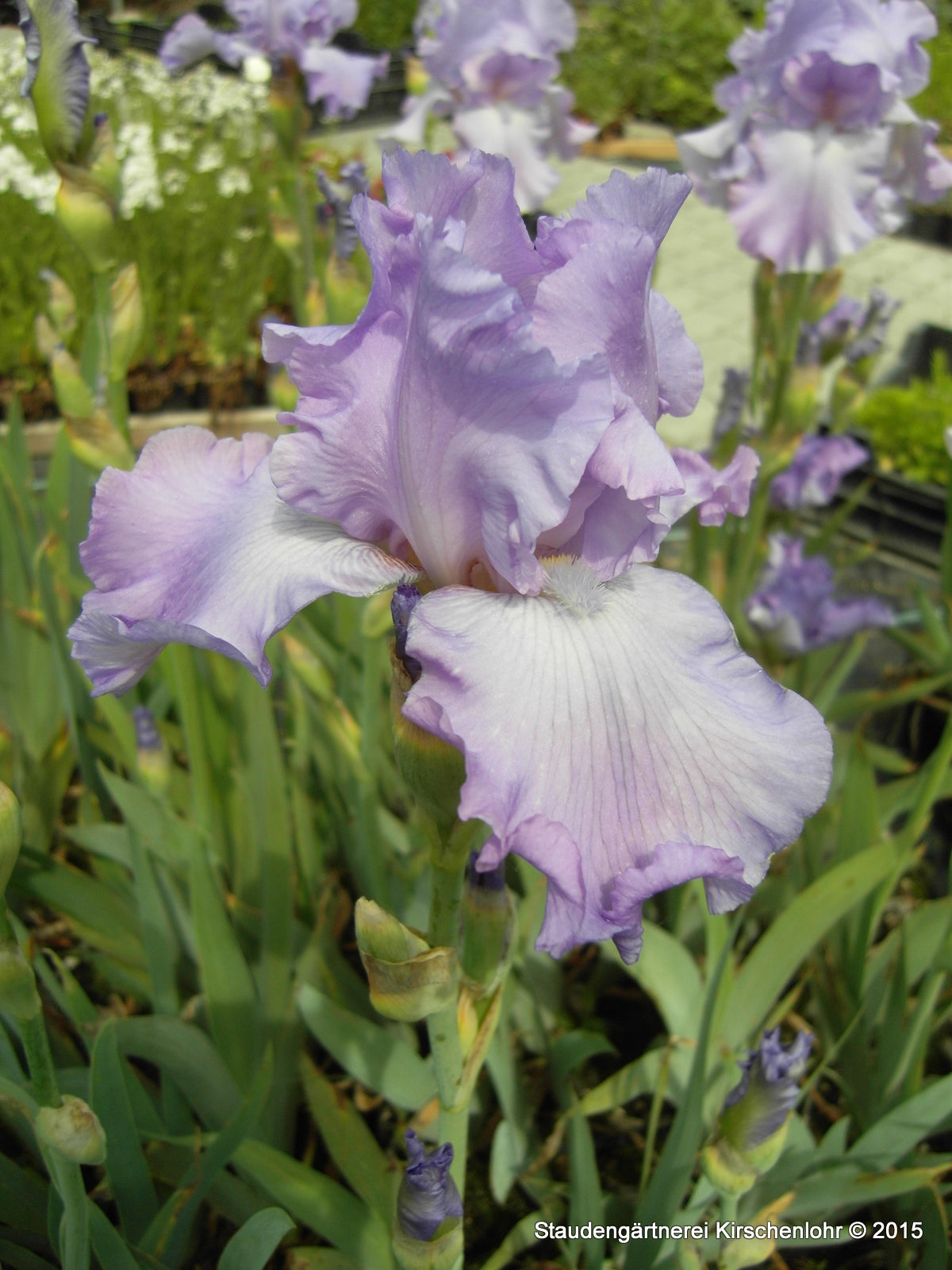 Riesige Bicolore Sorte mit hellblauen Blüten und dunkelblauen Sepalen. Stabile Blumen und zahlreiche Knospen pro Stiel. Sehr begehrt!