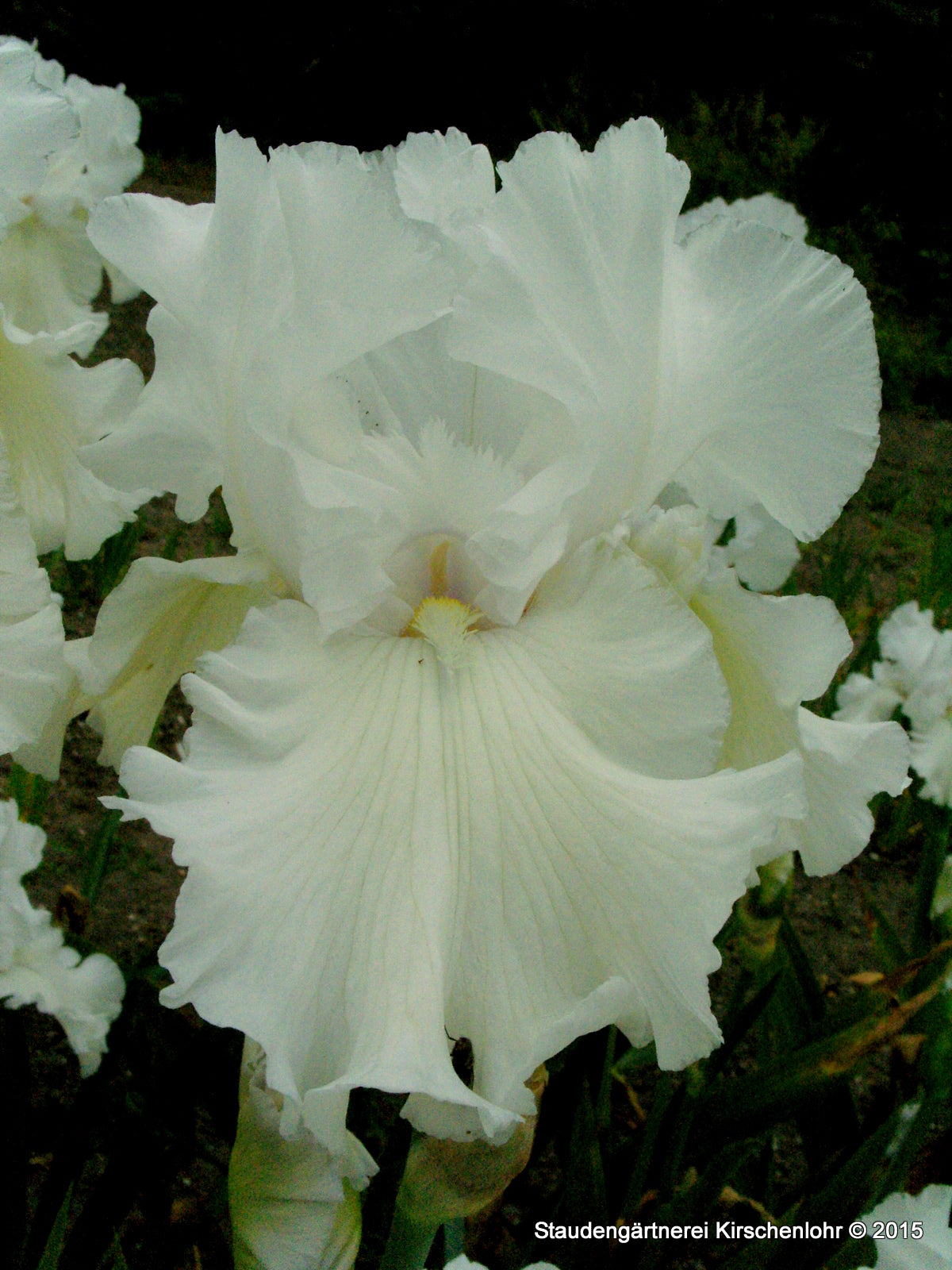 Eine der schönsten Weißen. Schwingend, gewellte Blütenränder. Elfenbeinfarbene Bart. Das Weiß ist makellos.