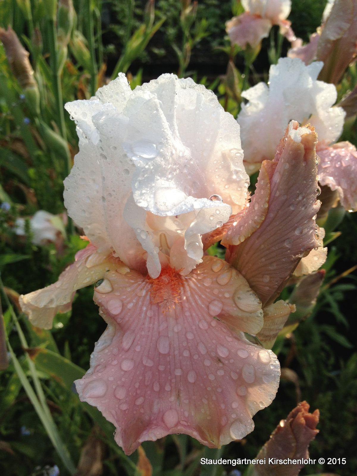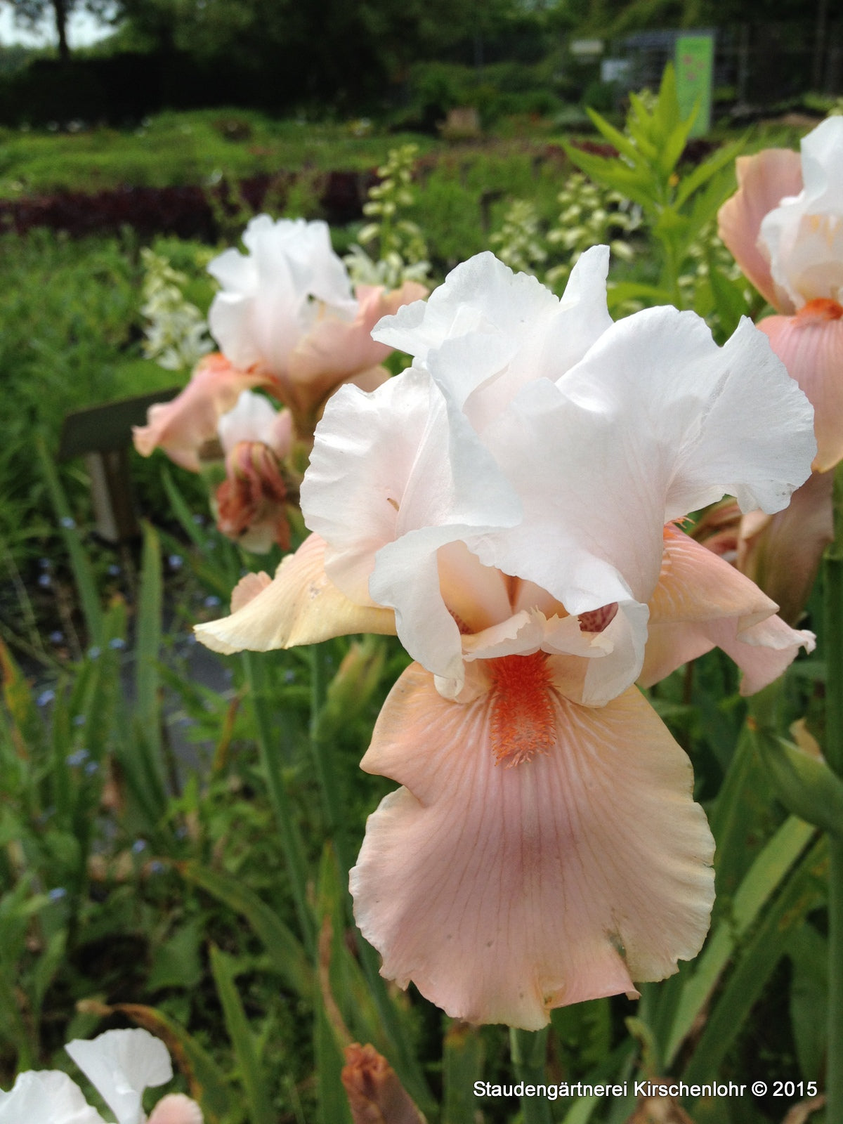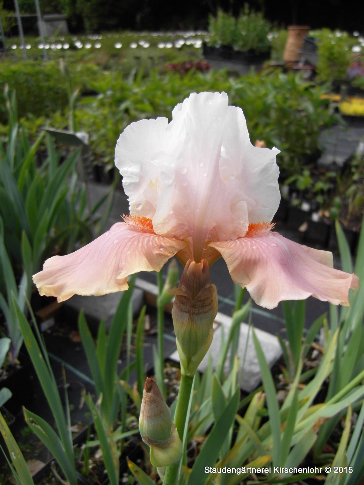 Amoena. Perfekter Kontrast zwischen sehr weißen Blütenblättern und uni-rosa Sepalen. Rot-orangefarbige Bärte.