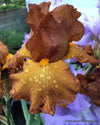 Hellbrauner Dom und kupfergelbe, halb waagerechte Sepalen und fein gezackten Rändern. Orangegelbe Bärte. Blumen von mittlerer Größe.