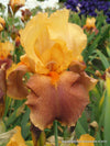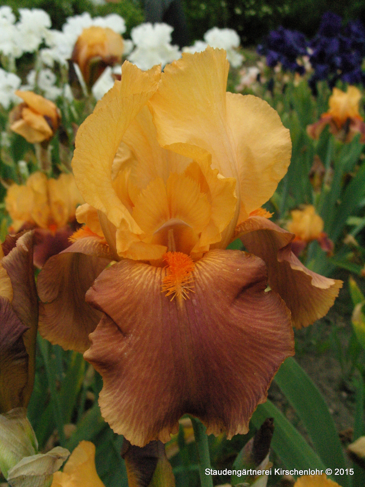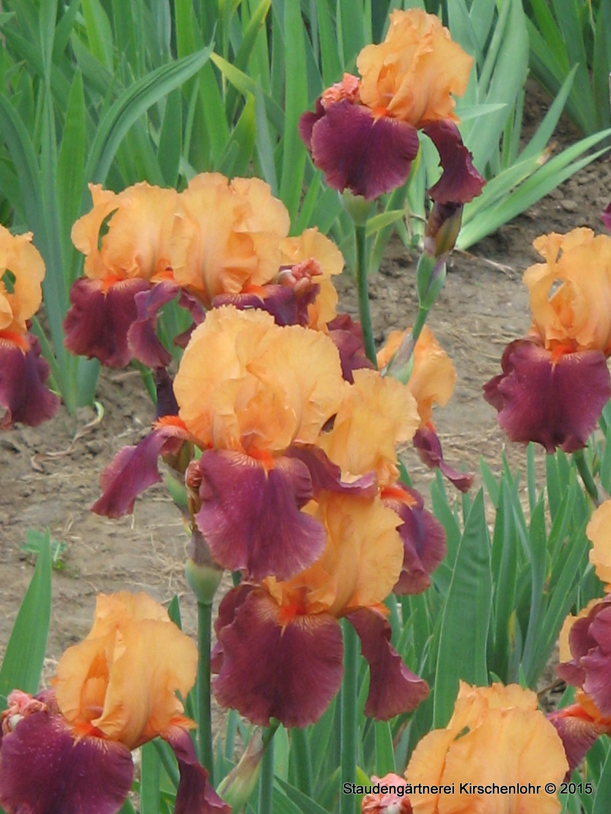 Hervorragende Variegata. Leuchtende, apricot bis orangefarbene Domblätter und erdbeerrote Sepalen. Mandarinefarbige Bärte. Gut verzweigte Schäfte.