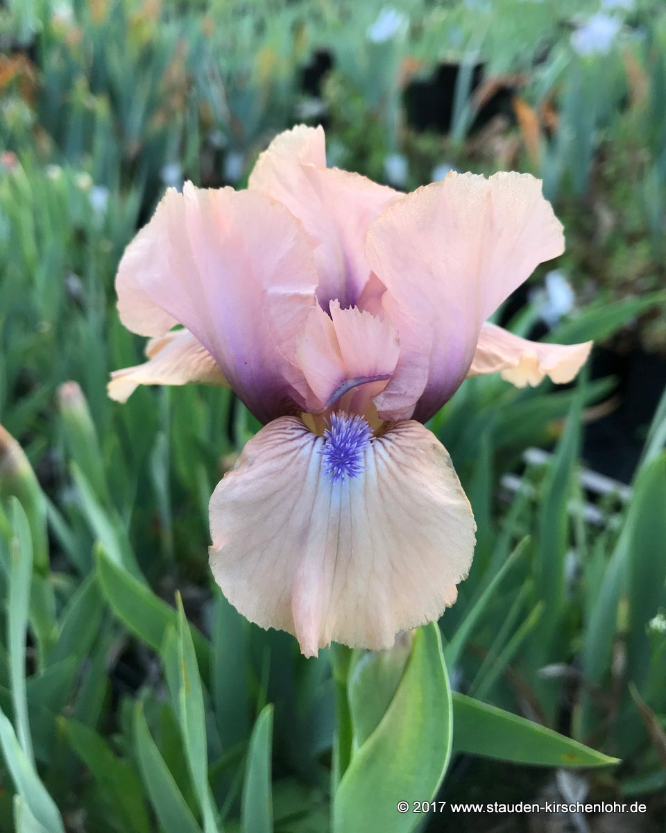 Altrosa Blüten. Die Bärte sind auffällig blau.