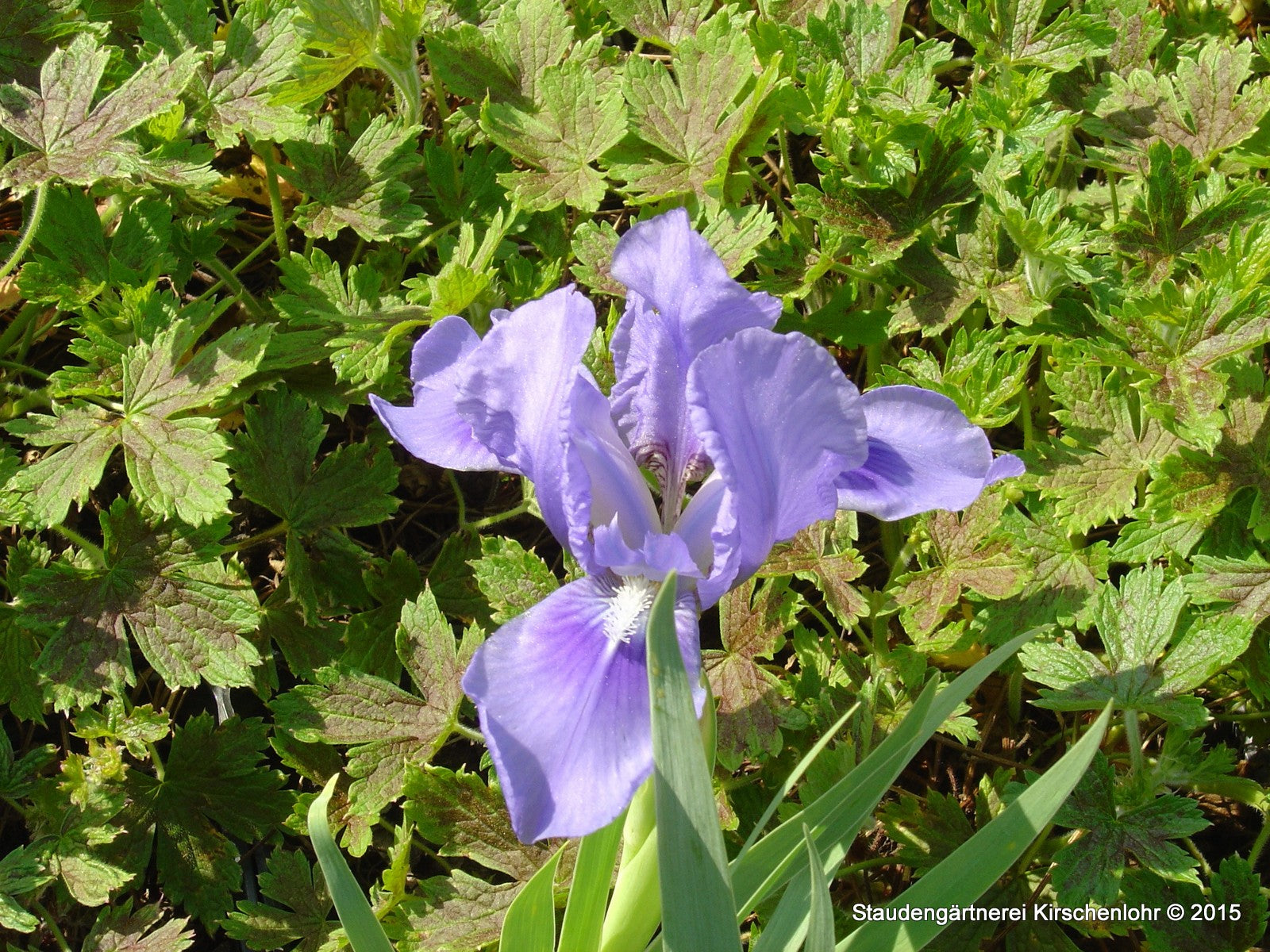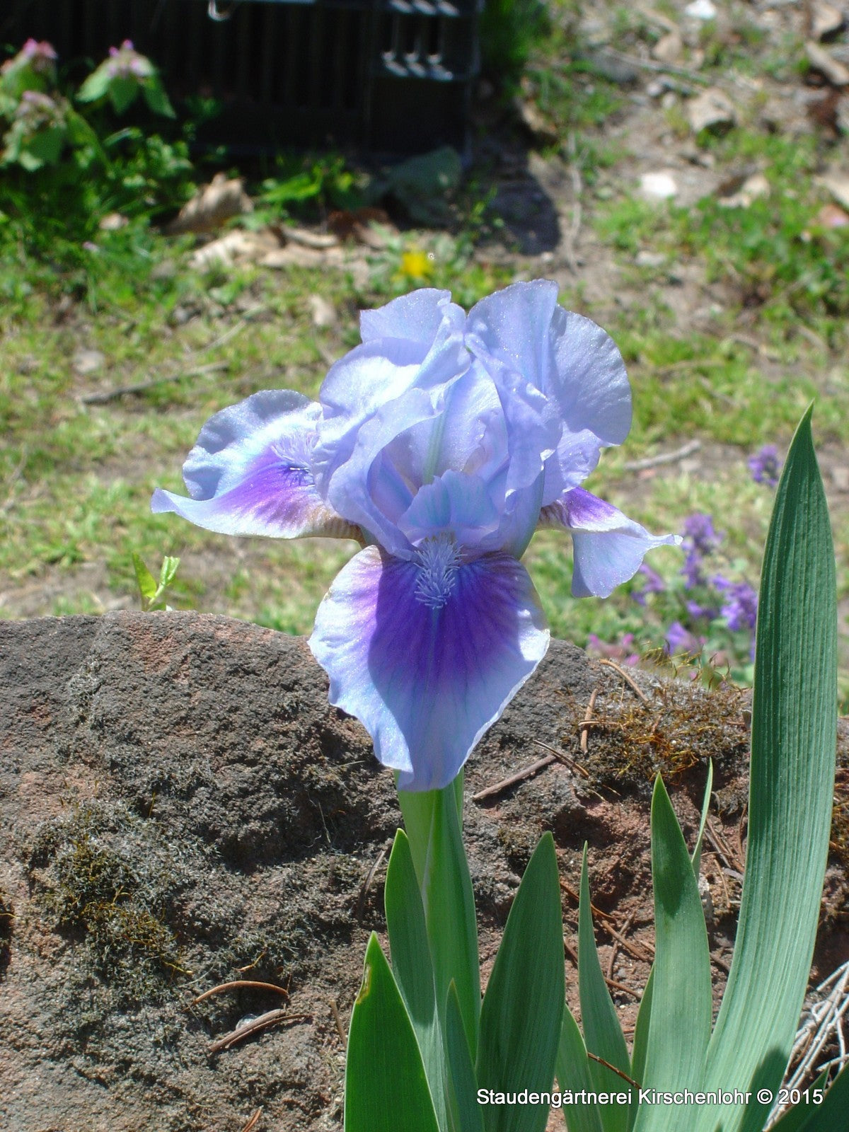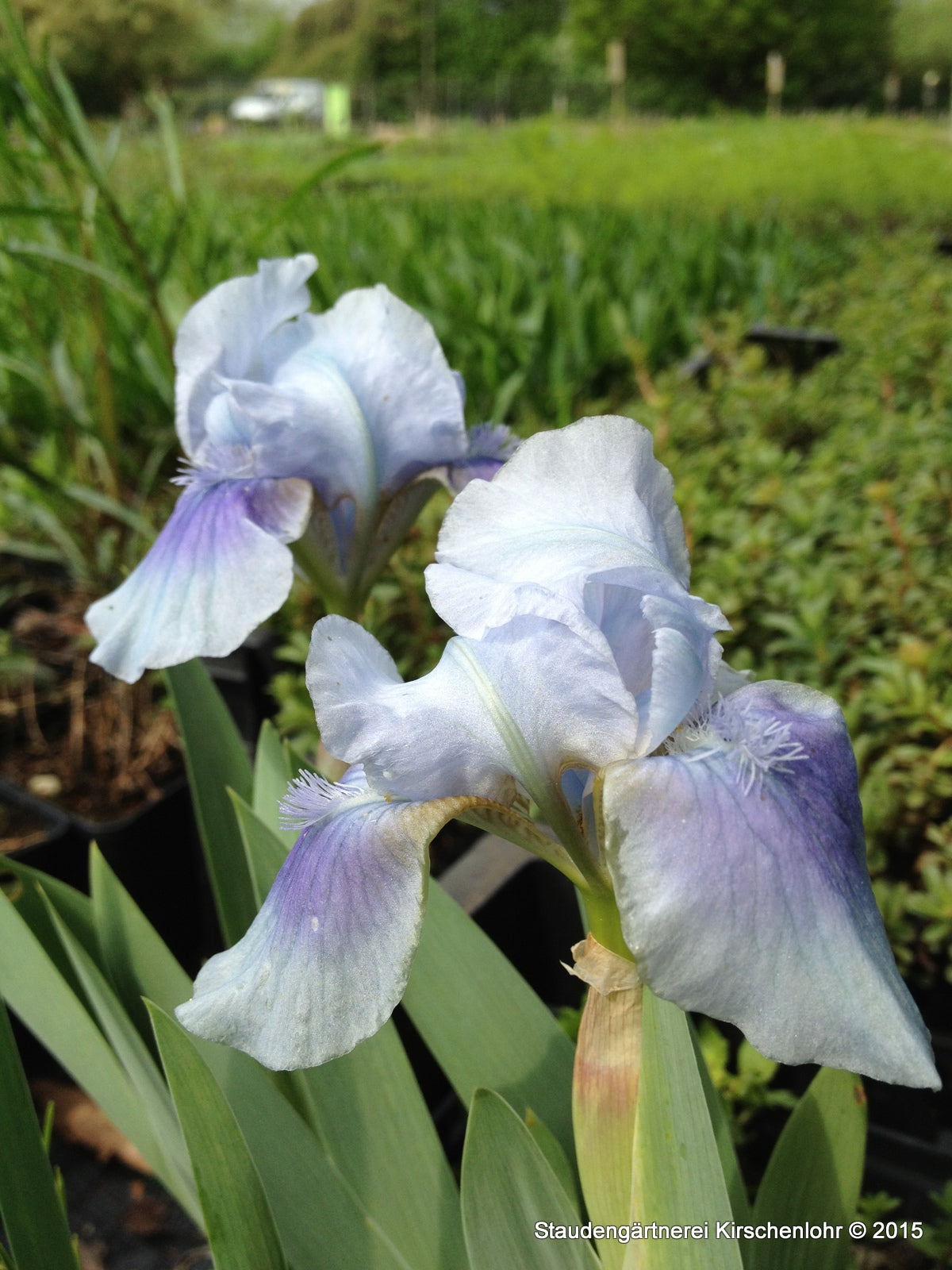 Satt hellblaue Blüten mit großem, violettblauem Spot auf den Sepalen. Hellblaue Bärte.