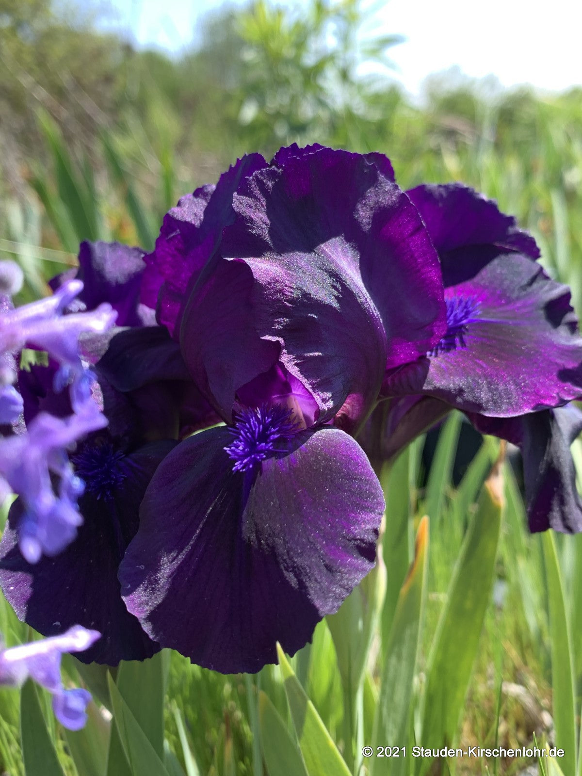 Purpurschwarze Blüten mit samtig dunklem Fleck auf den Hängeblättern. Violettblauer Bart.