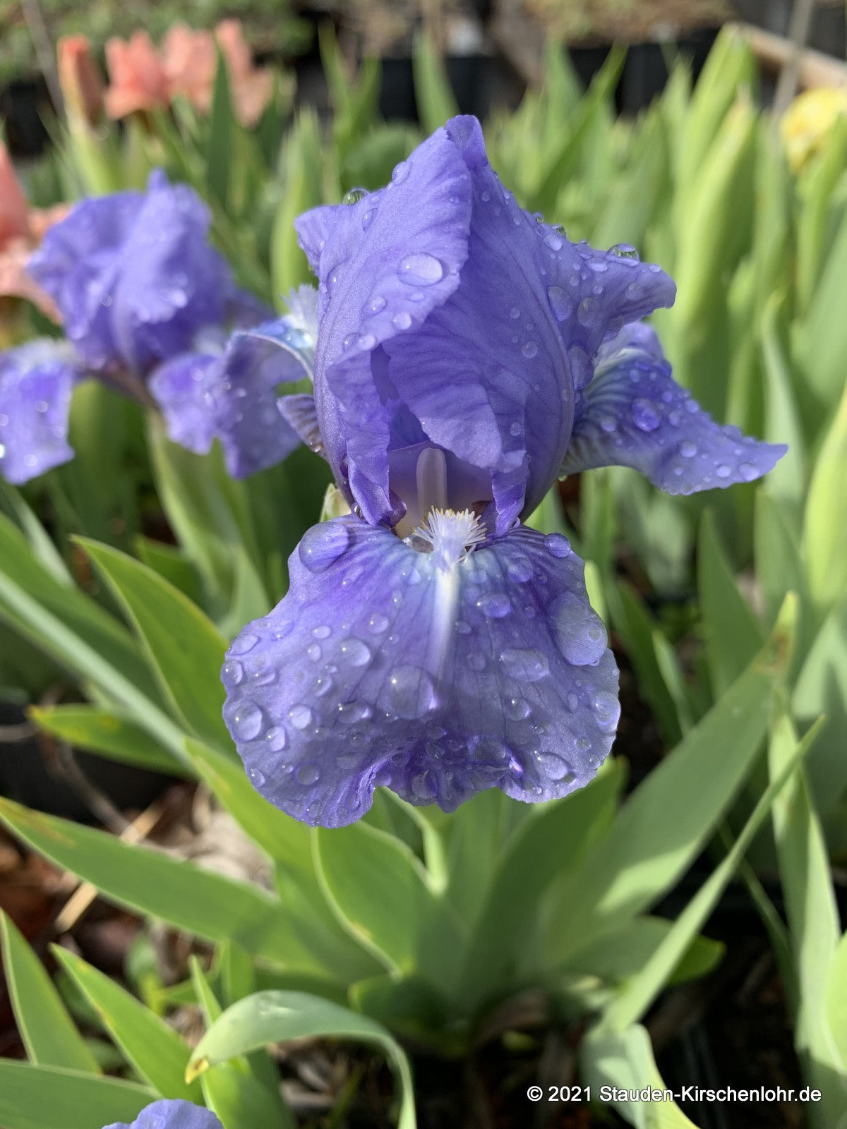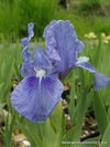 Mittelblaue Blüten mit dunklerem Spot auf den Hängeblättern. Hellblauer, fast weißer Bart. Altbewährte Sorte.