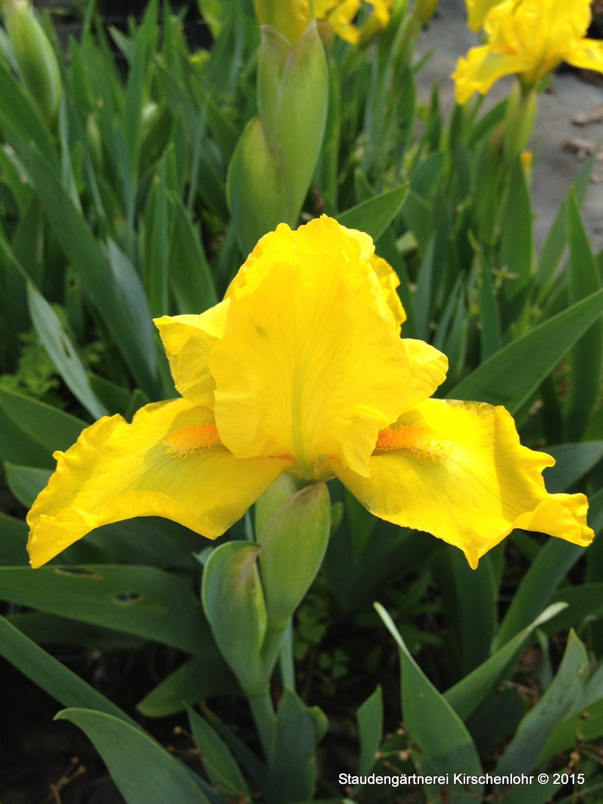 Kräftig kadmiumgelbe Blüten mi safrangelben Bärten. Sehr leuchtende Farbe.