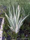 Mittel- bis bleich violettblaue Blüten. Gelblich-weiße Bärte. Auffällige Form mit weißer Panaschierung der Blätter.