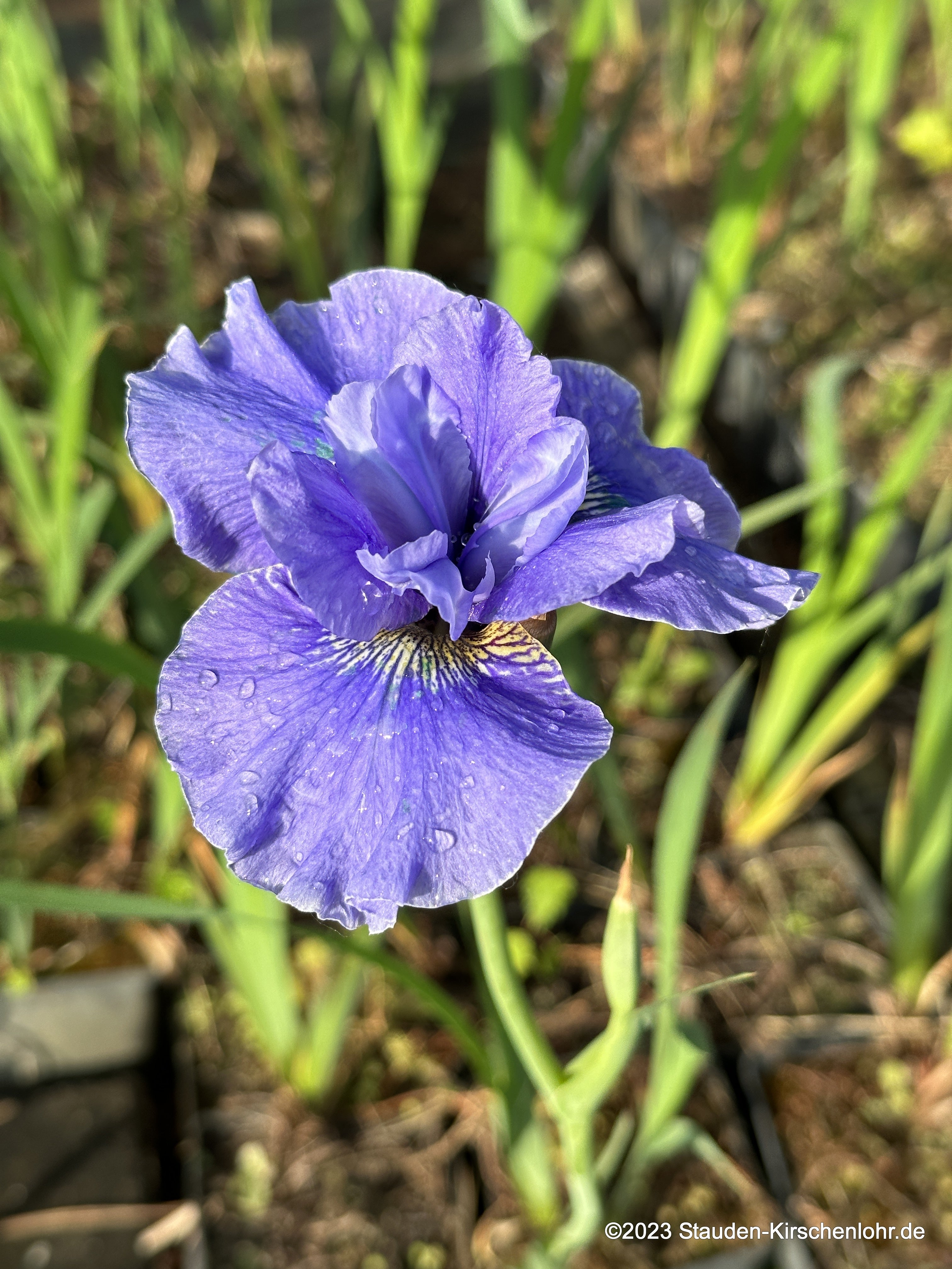Tetraploide rein hellblaue Blüten an starken, gut verzweigten und hohen Stielen. Breite Hängeblätter und kräftige, aufrechte Standards geben der Blüte eine moderne, aber raumfüllende Gestalt. Lineale, länglich zugespitzte Blätter. Sommergrün. Tamberg Züchtung.