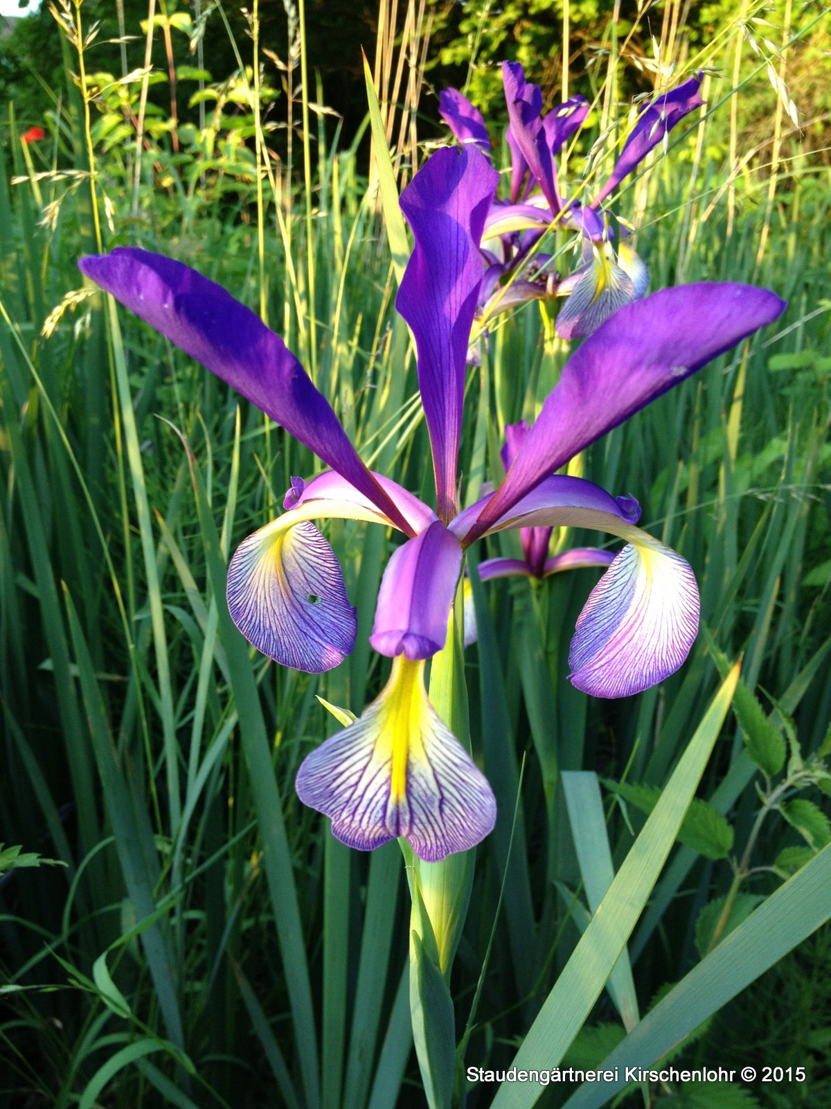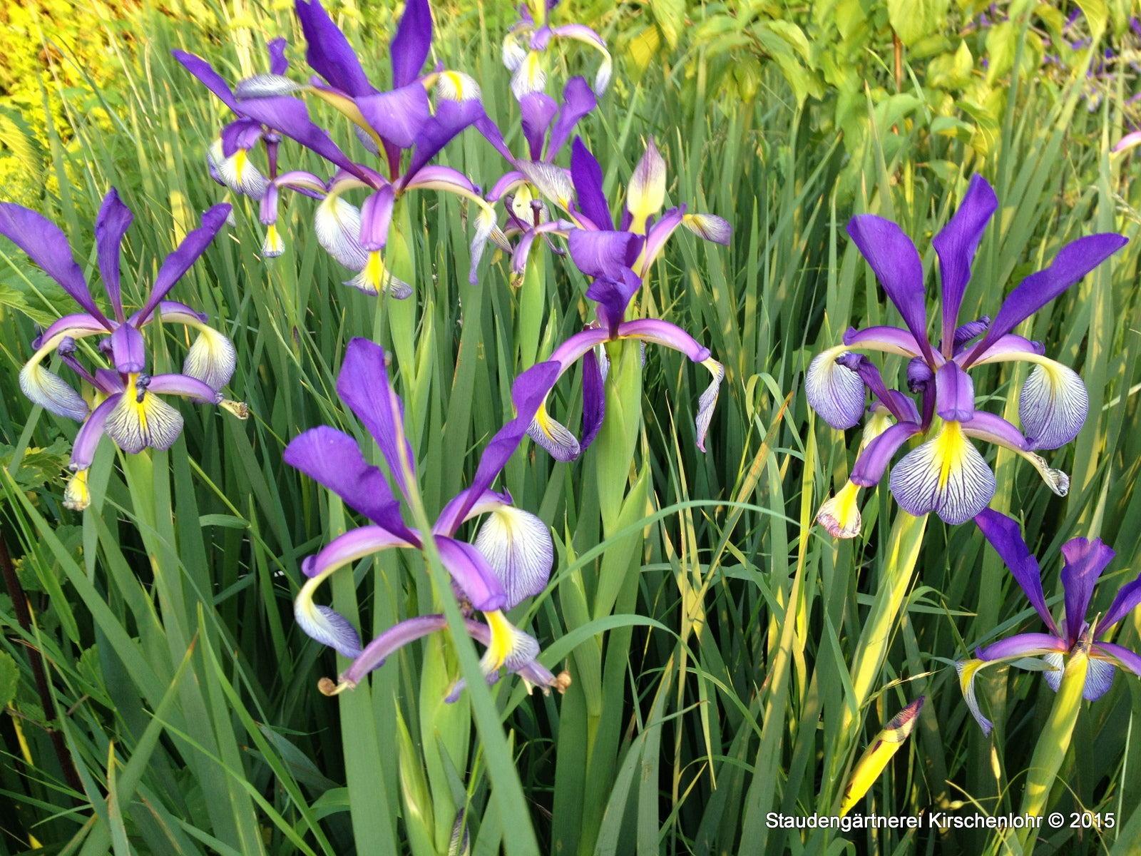 Schlanke, leuchtend mittelblaue Blüten, durchzogen von dunkleren Adern. Hängeblätter zur Mitte hin hellgelb. Blaugrüne straff aufrechtwachsende Horste.