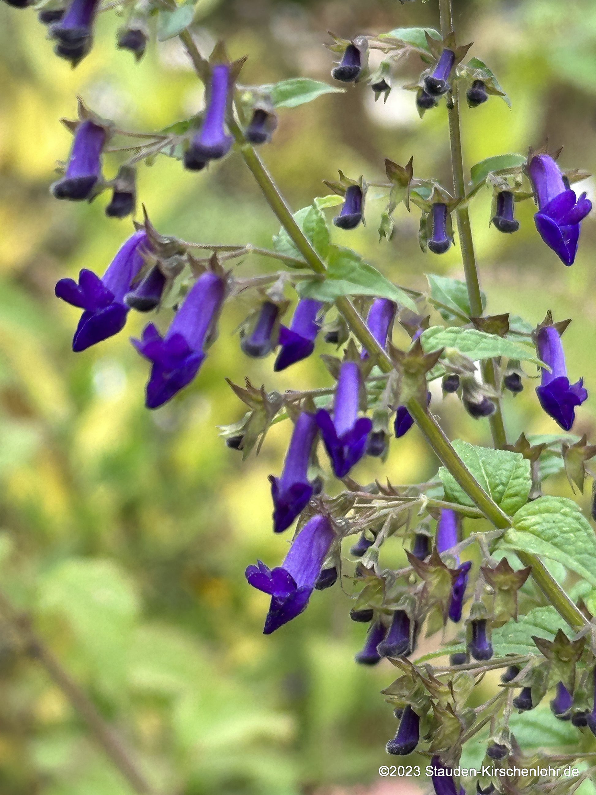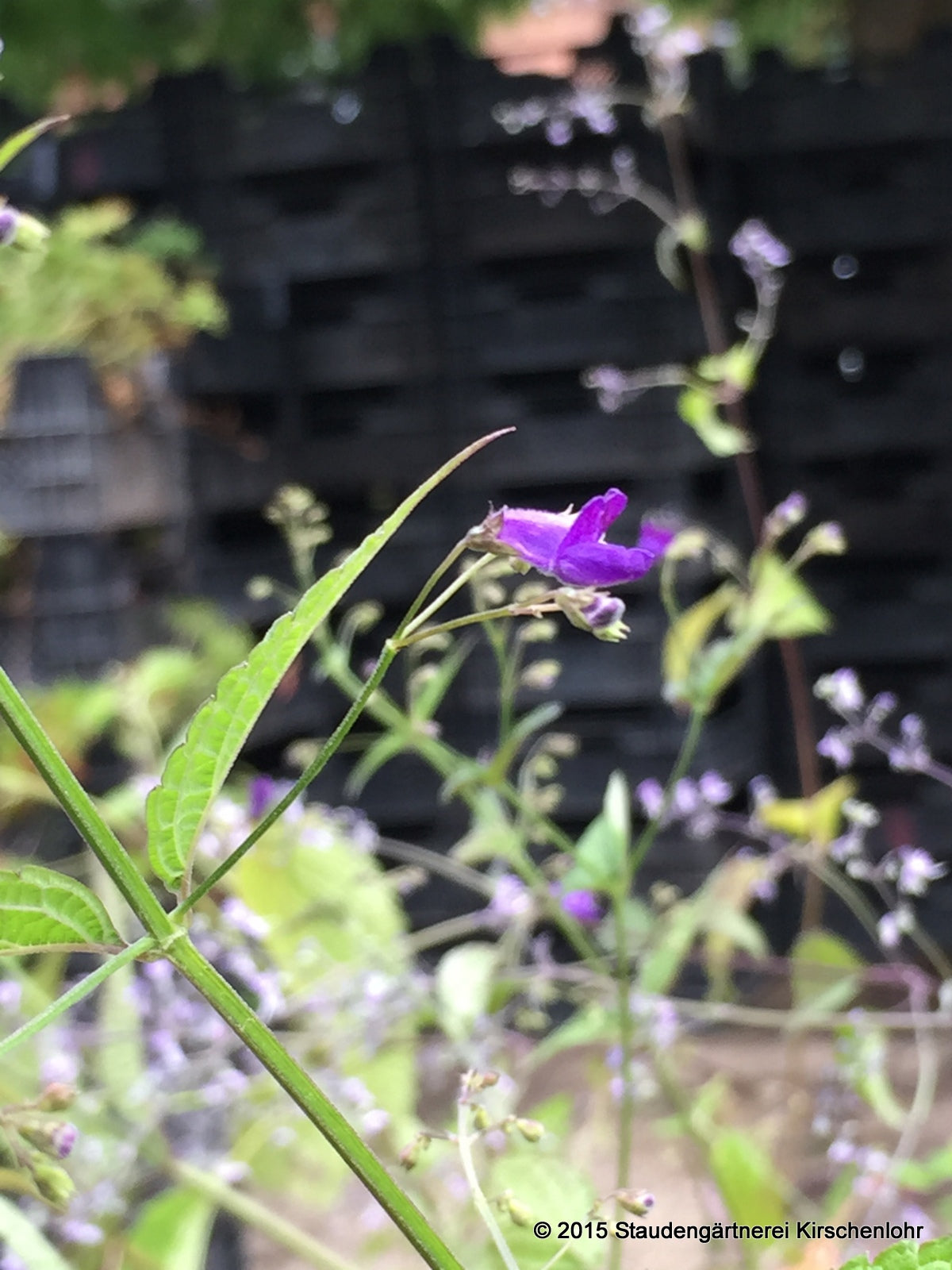 Dunkel violettblaue Lippenblütchen in einer lockeren Rispe. Lanzettliche Blätter mit gesägtem Blattrand. Sommergrün syn. Plectranthus, Rabdosia