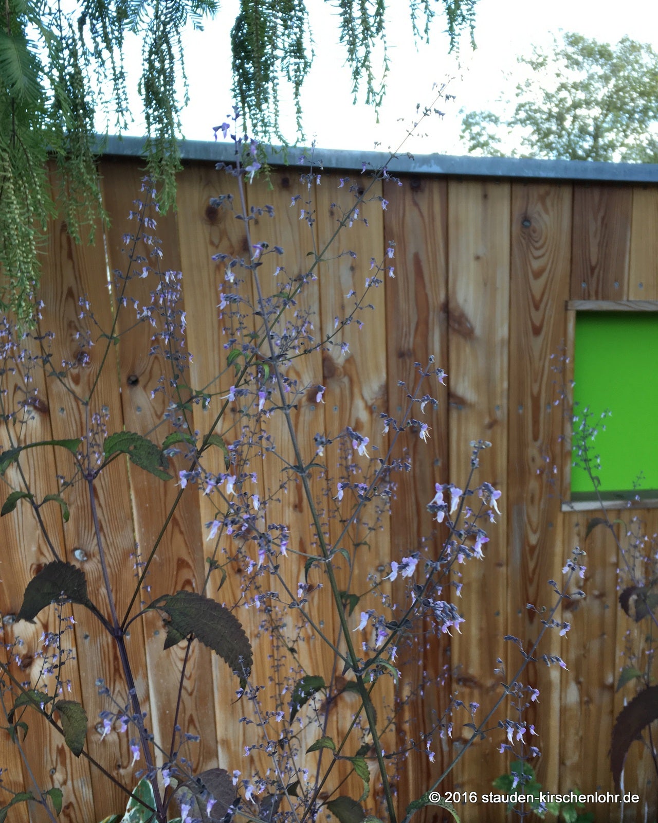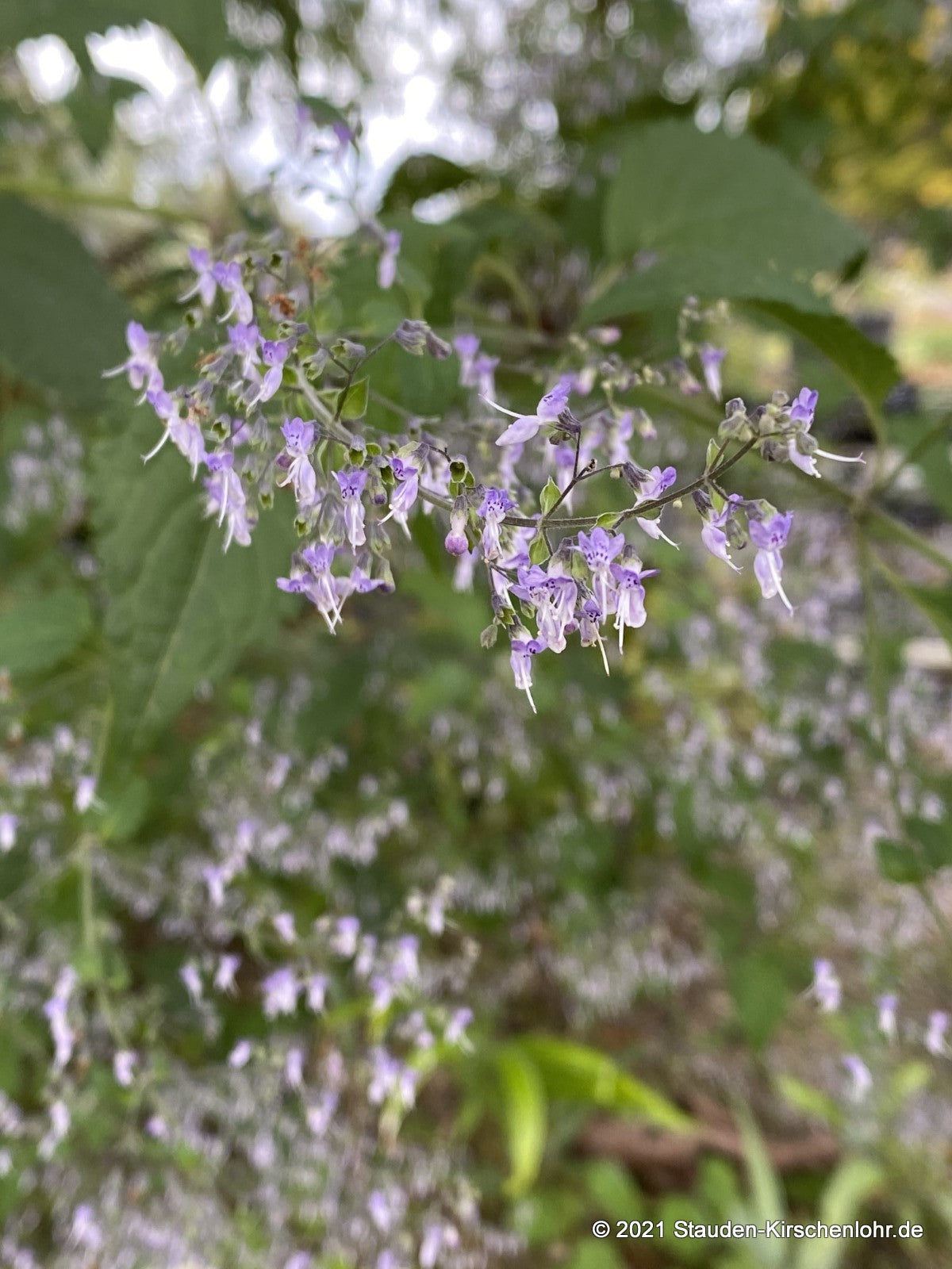 Hellblaue Lippenblütchen in einer lockeren Rispe. Breitlanzettliche Blätter mit gesägtem Blattrand. Purpurfarbene Herbstfärbung. Sommergrün. syn. Plectranthus, Rabdosia