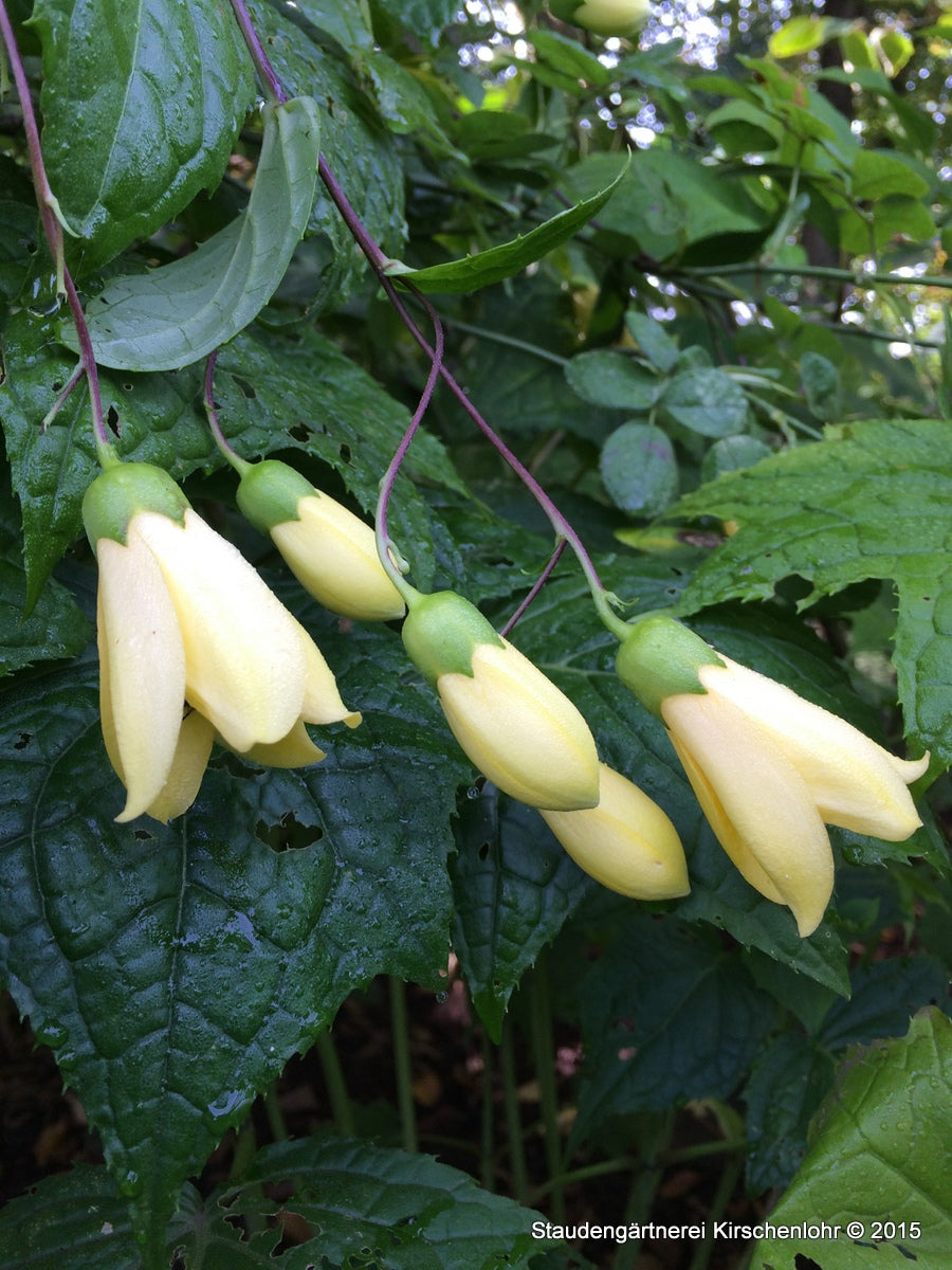 Wachsartige, hellgelbe Glocken. Hellgrünes rundliches bis herzförmiges Laub mit spitzlappigem Blattrand. Sommergrün.