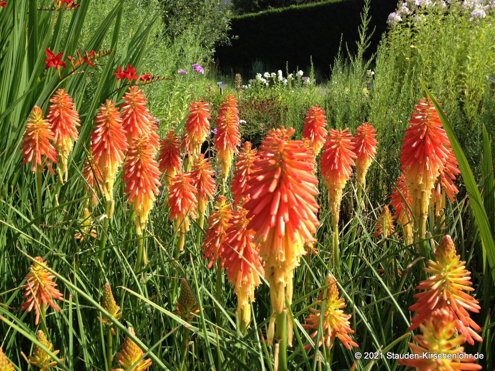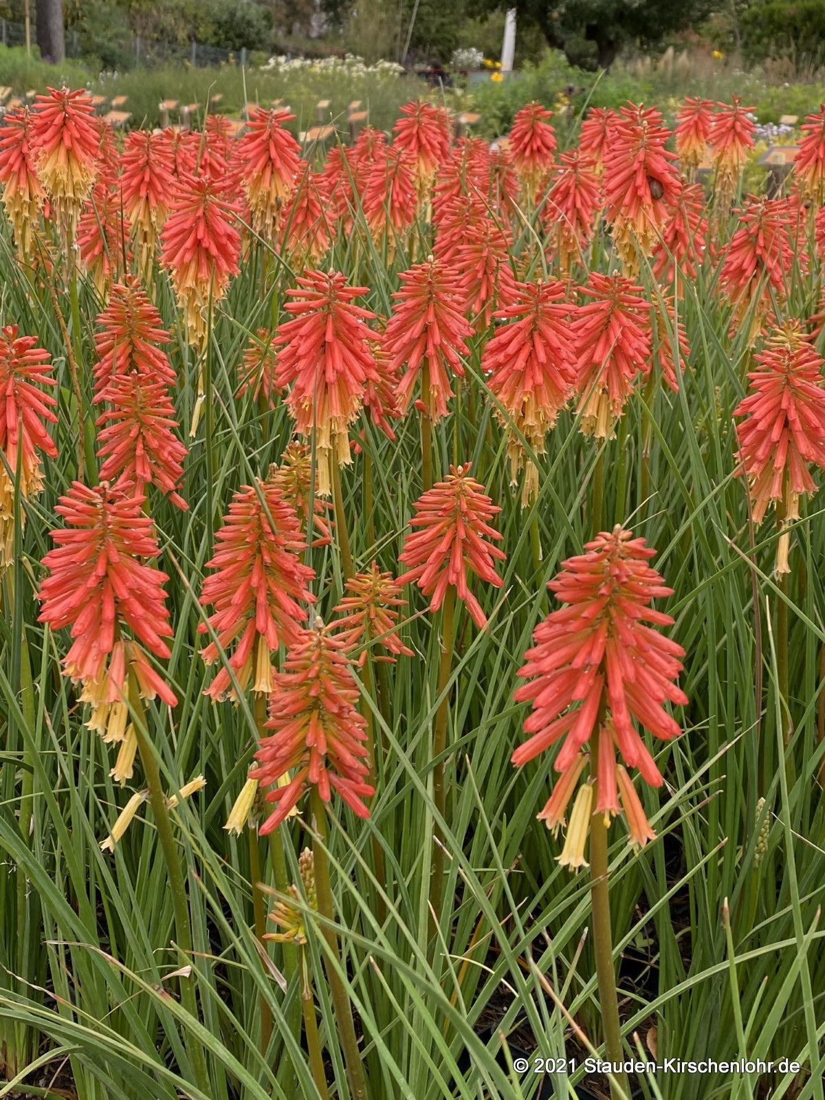 Leuchtend hellrote Blütenknospen die sich auffällig orangegelb öffnen. Auffälliger Strukturbildner. Bringt sehr oft Nachblüten (Remontiert). Grasartiges Laub.
