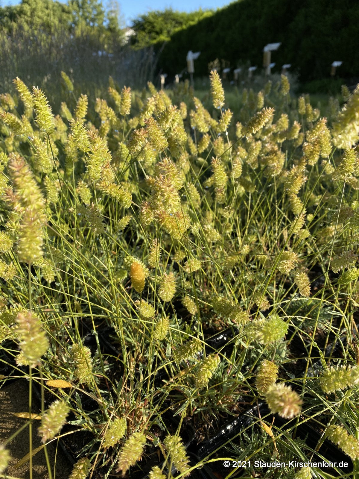 Blassgrüne, dichte, zylindrische Blütenähre. Im Abblühen hell beige bis braun. Die Grasartigen Blätter sind graugrün. Niedrige Sorte. Trockenheitstolerant. Wintergrün.