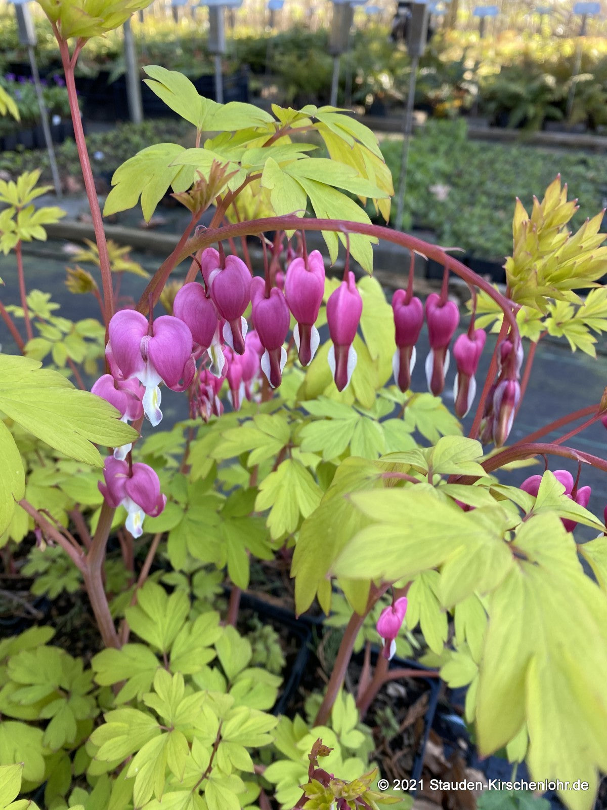 Herzförmige, rosa Blüten mit weißer, anhängender "Träne", in bogigen Trauben angeordnet. Dreilappiges, ovales, auffällig gelbes Laub. Zieht nach der Blüte ein. syn. Dicentra s. 'G.'