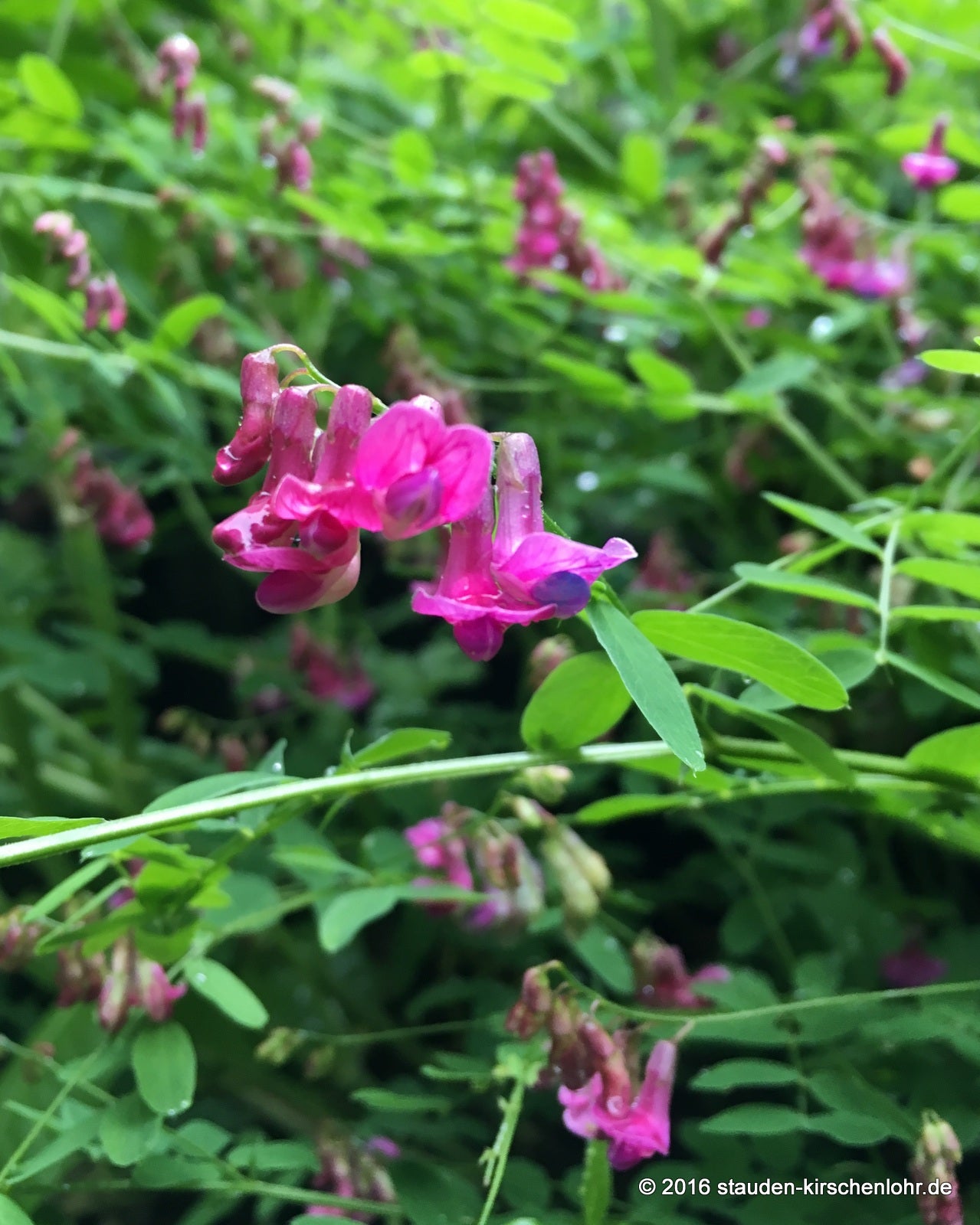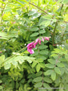 Violette, schmetterlingsartige Blüten; im Verblühen fast schwarz werdend. Fiederartige Blätter an aufrechten Trieben. Optimal für den Gehölzrand. Sommergrün.