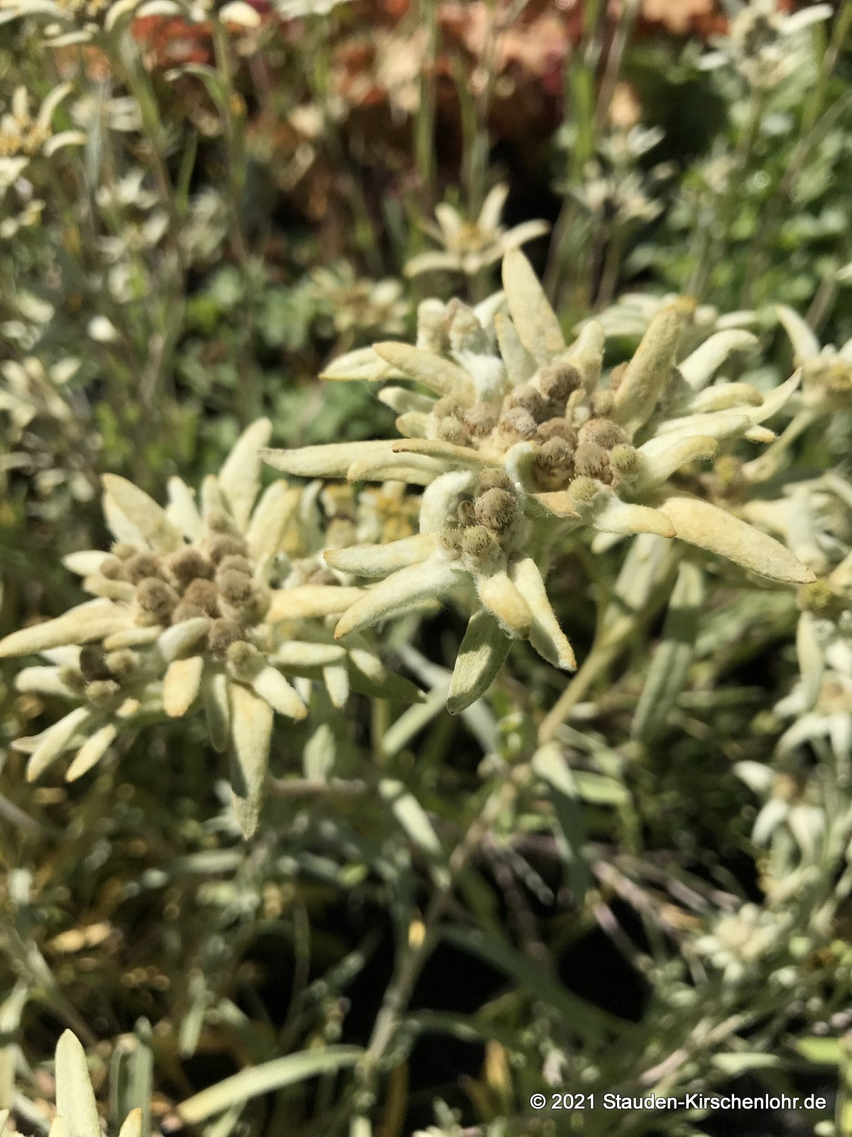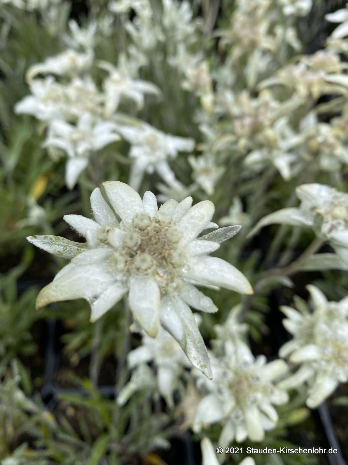 Filzig weißbehaarte Hochblätter formen einen mehrzackigen Stern und umgeben den eigentlichen, gelblichen Blütenstand. Die Blütenstängel wachsen aufrecht empor. Die Blätter lineal, grauweiß und filzig. Wahrzeichen der Alpen.