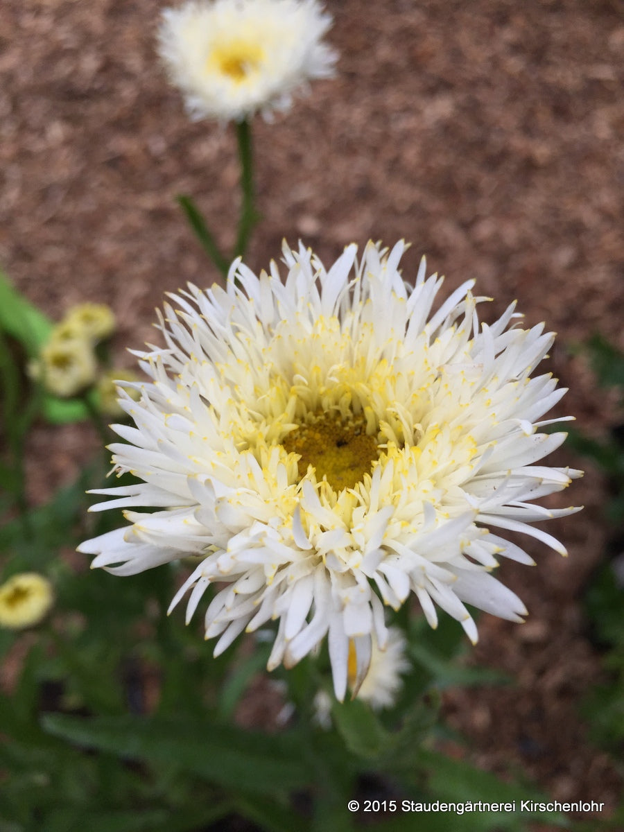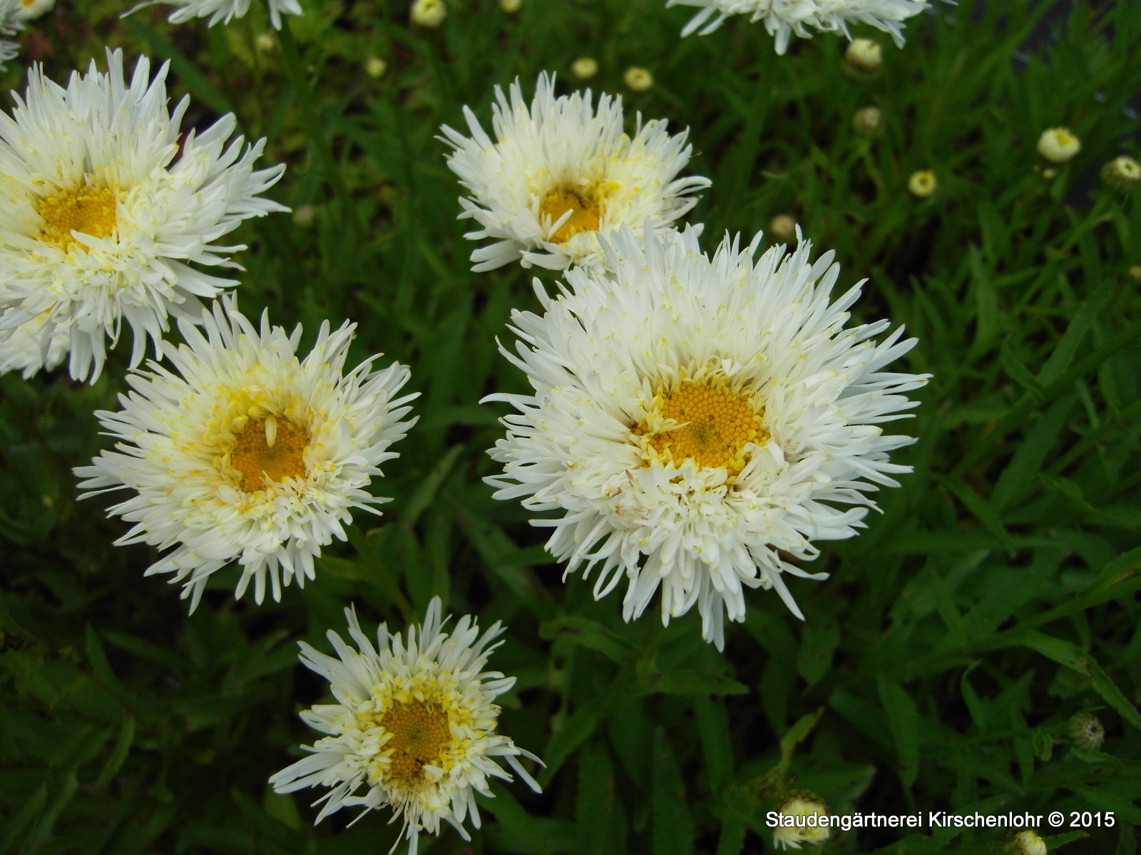 Breite, reinweiße Zungenblüten. Scheibe leuchtend orangegelb. Blüht gut nach. Sehr gesundes, weitgehend wintergrünes, spatelförmiges Laub mit gesägtem Blattrand. syn. Chrysanthemum maximum 'Becky'