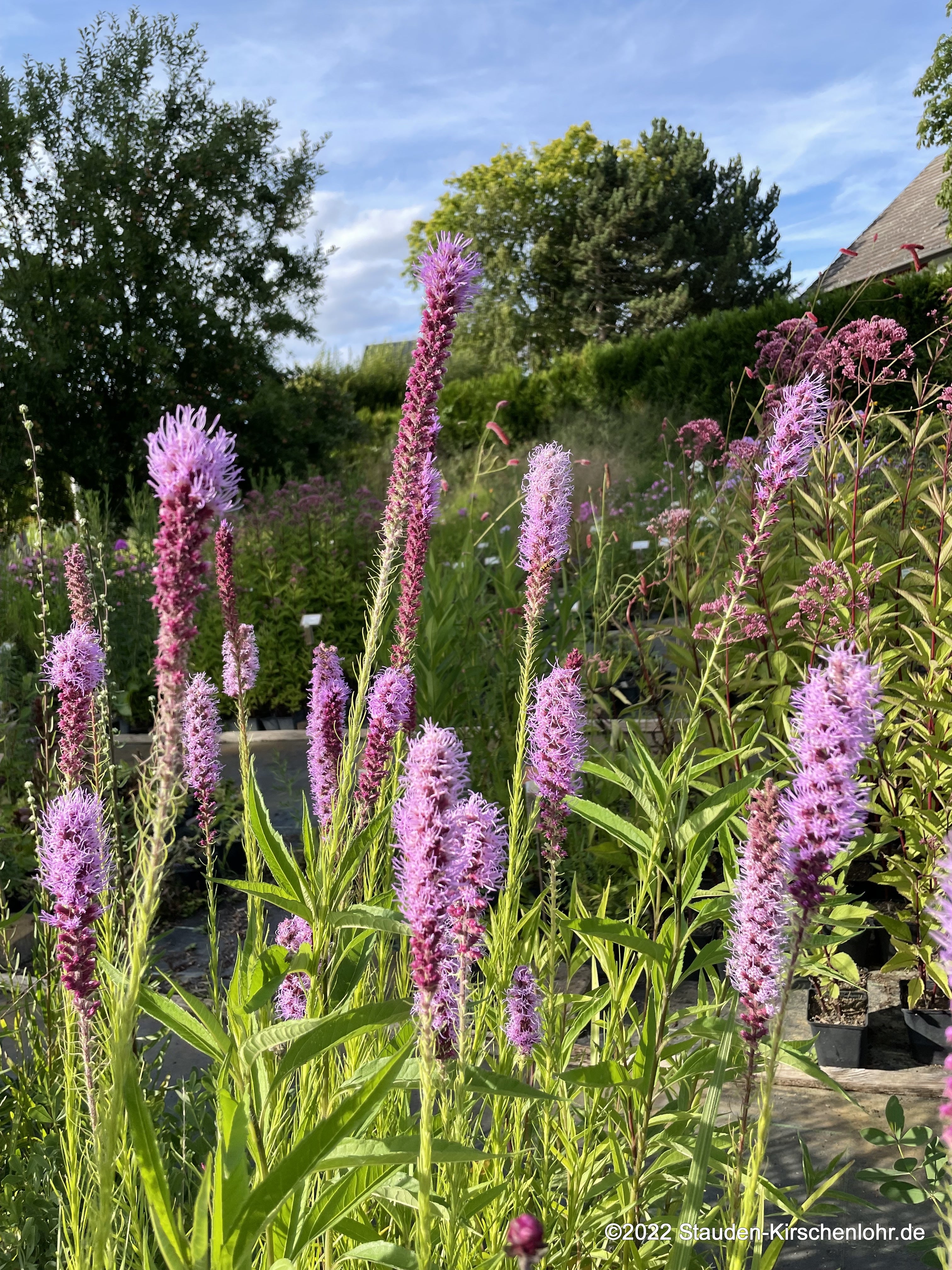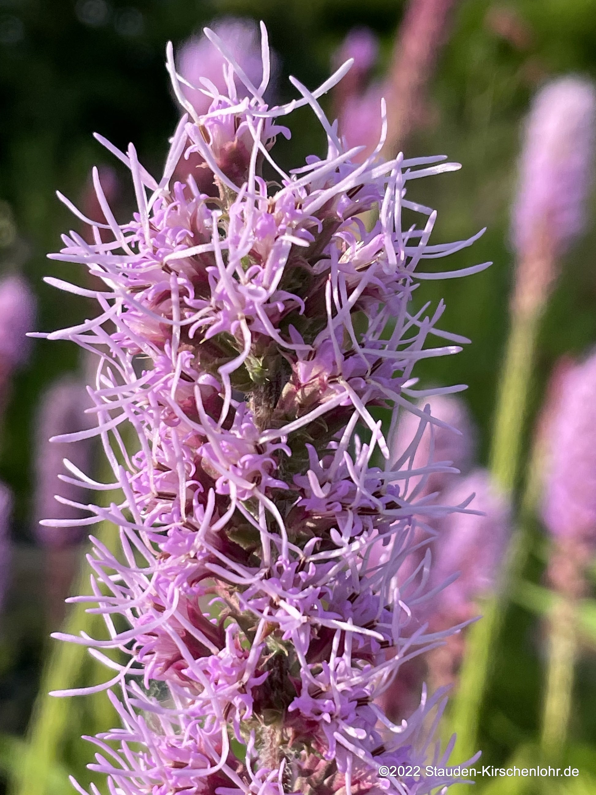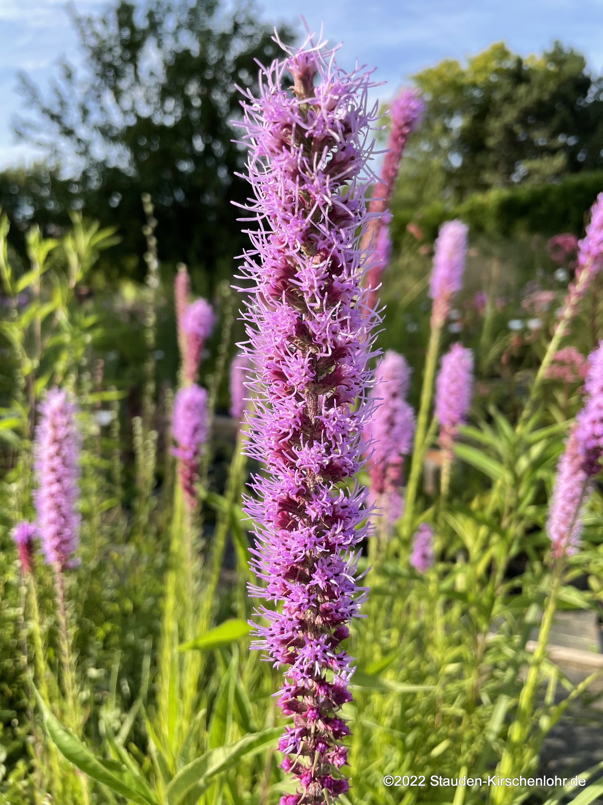 Violette Blütenkörbchen an langen Scheinähren. Lineale Blätter an aufrechten Trieben. Der beblätterte Stängel ist behaart. Viel filigraner als die bekannte L. spicata. Sommergrün.
