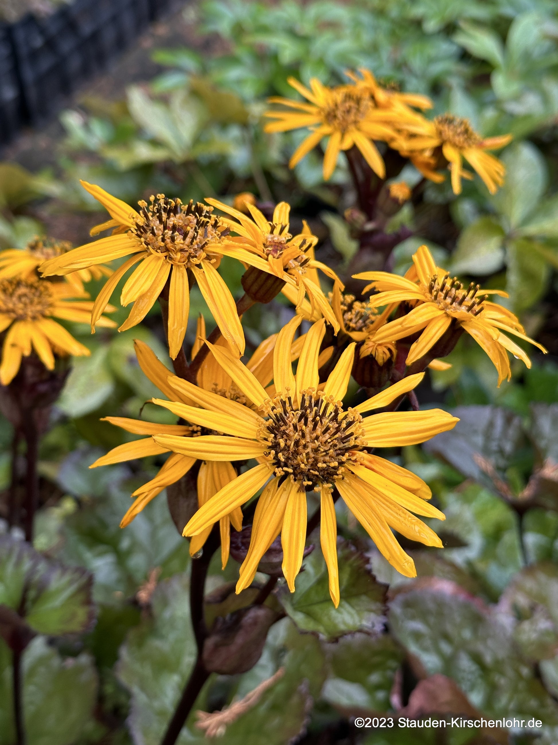 Tief orangegelbe Strahlenblüten, in einem scheindoldigen Blütenstand. Rundliche Blätter mit gezähntem Blattrand. Schwarzrote Blätter und Stängel. Sommergrün.