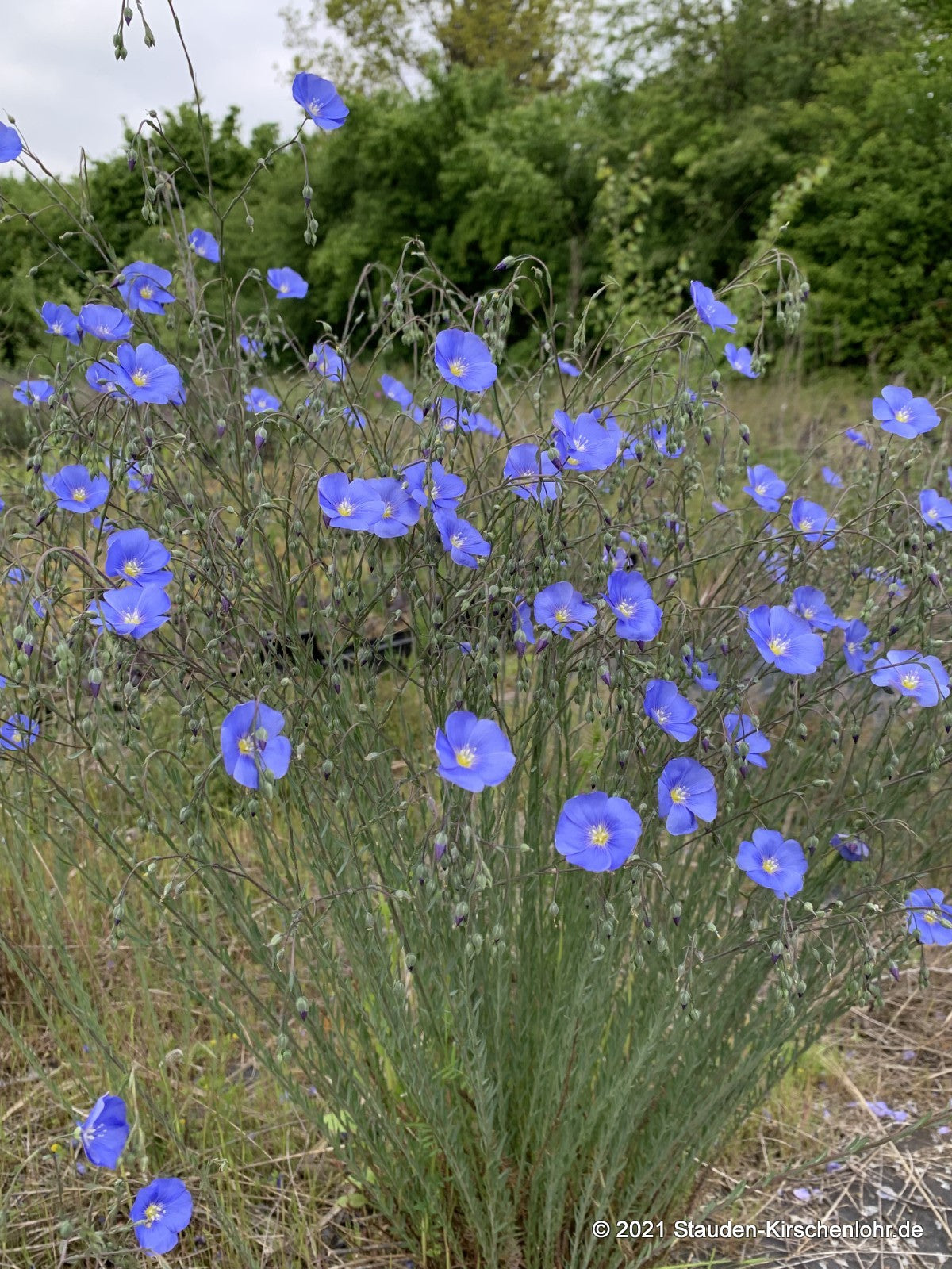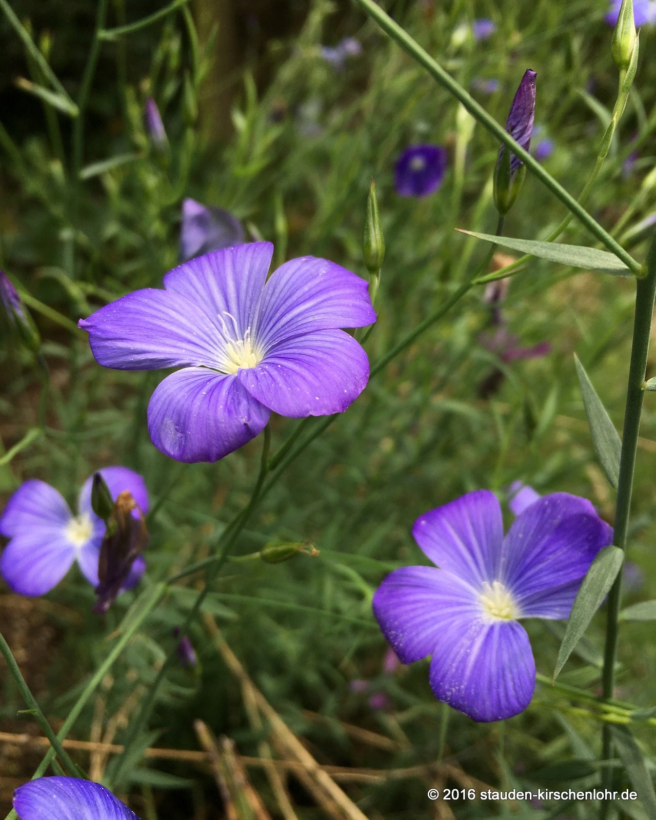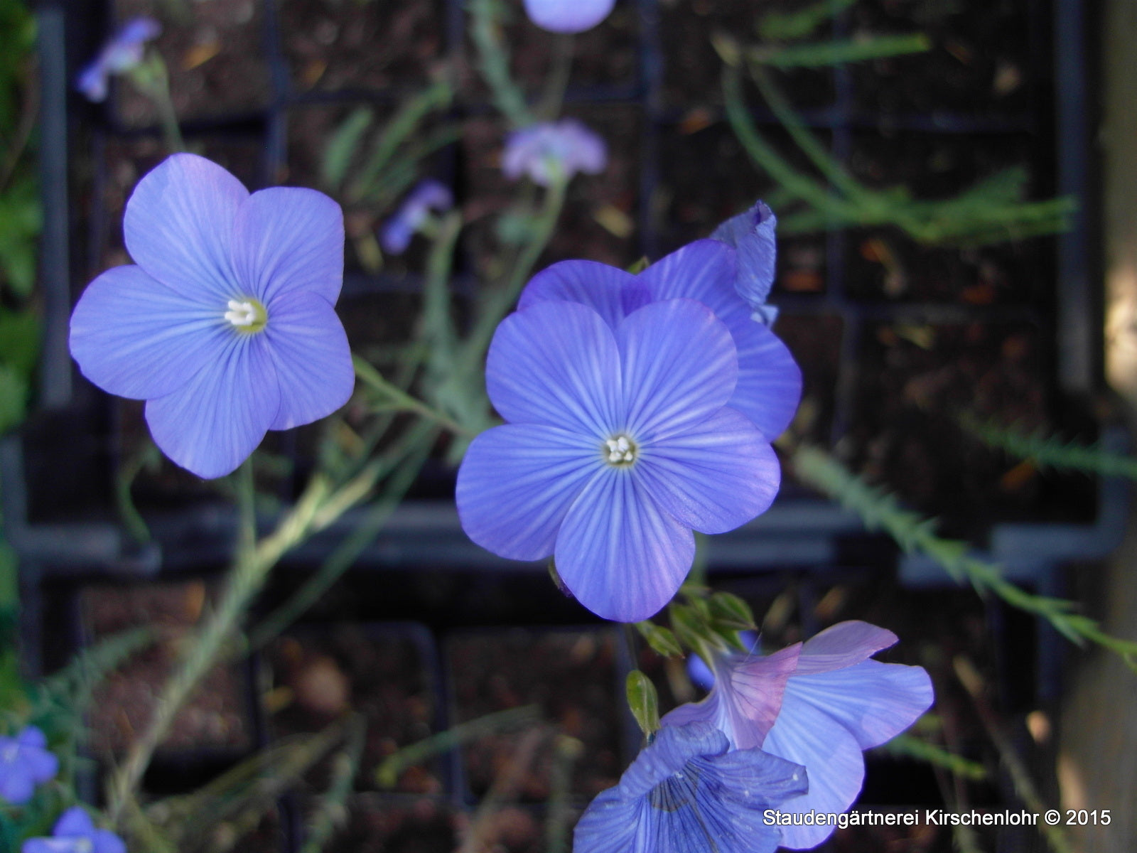 Wunderschöne, kräftig himmelblaue Blüten mit violettblauen Adern. Lanzettliche bis nadelige, graugrüne Blätter an aufrechten Trieben. Sommergrün.