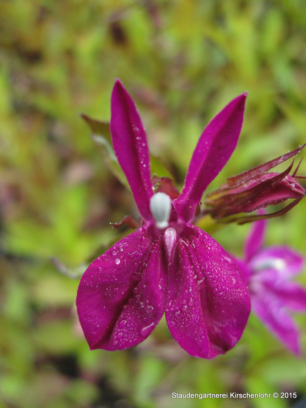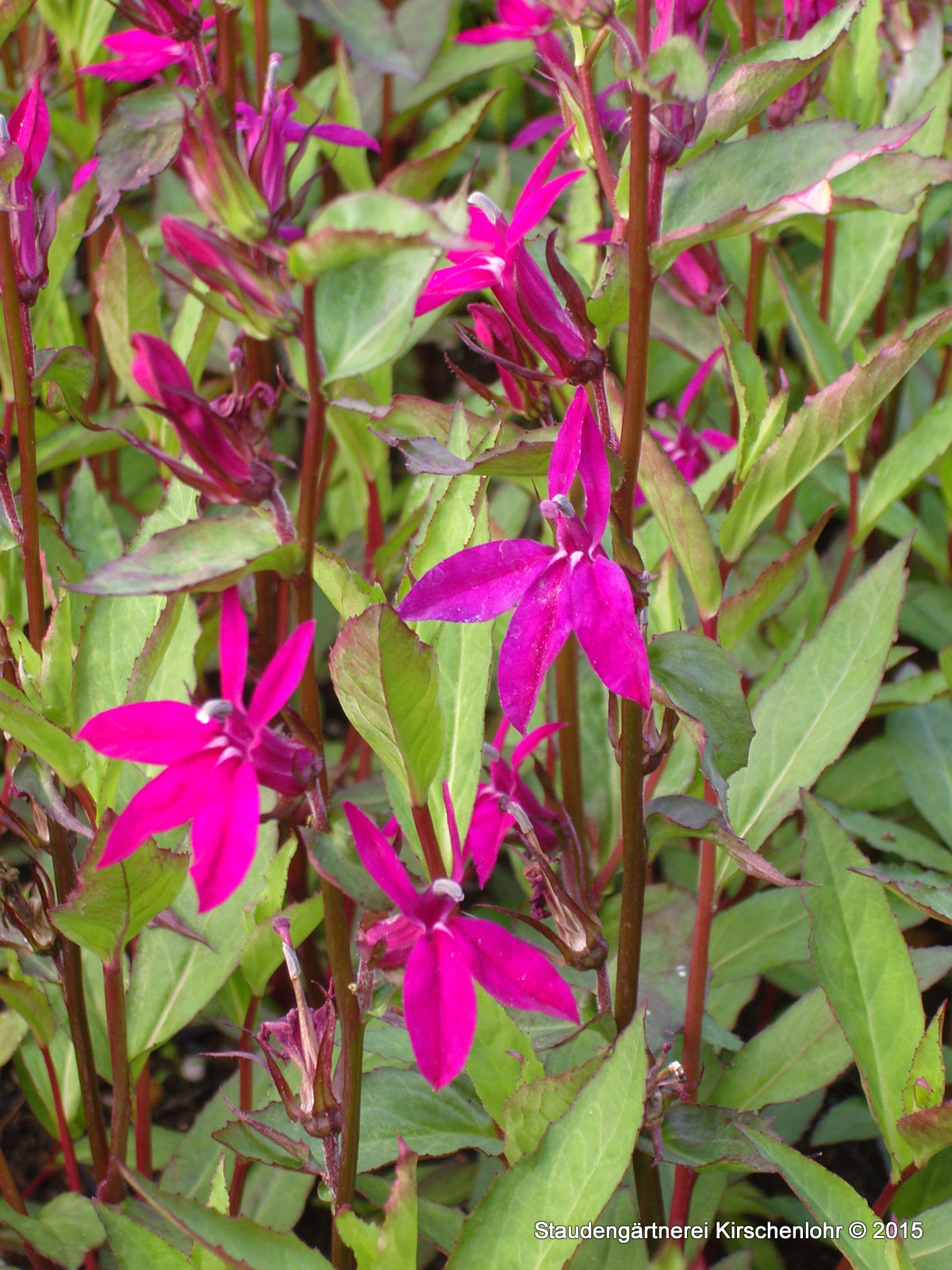Tiefpurpurfarbene Einzelblüten, asymmetrisch, röhrig, in einer dichten, ährigen Traube. Auffällig dunkelgrüne Blätter mit purpurrötlichem Anflug. Stängel beblättert. Kreuzung aus L. cardinalis x L. siphilitica. Bei guter Versorgung wirklich dauerhaft!
