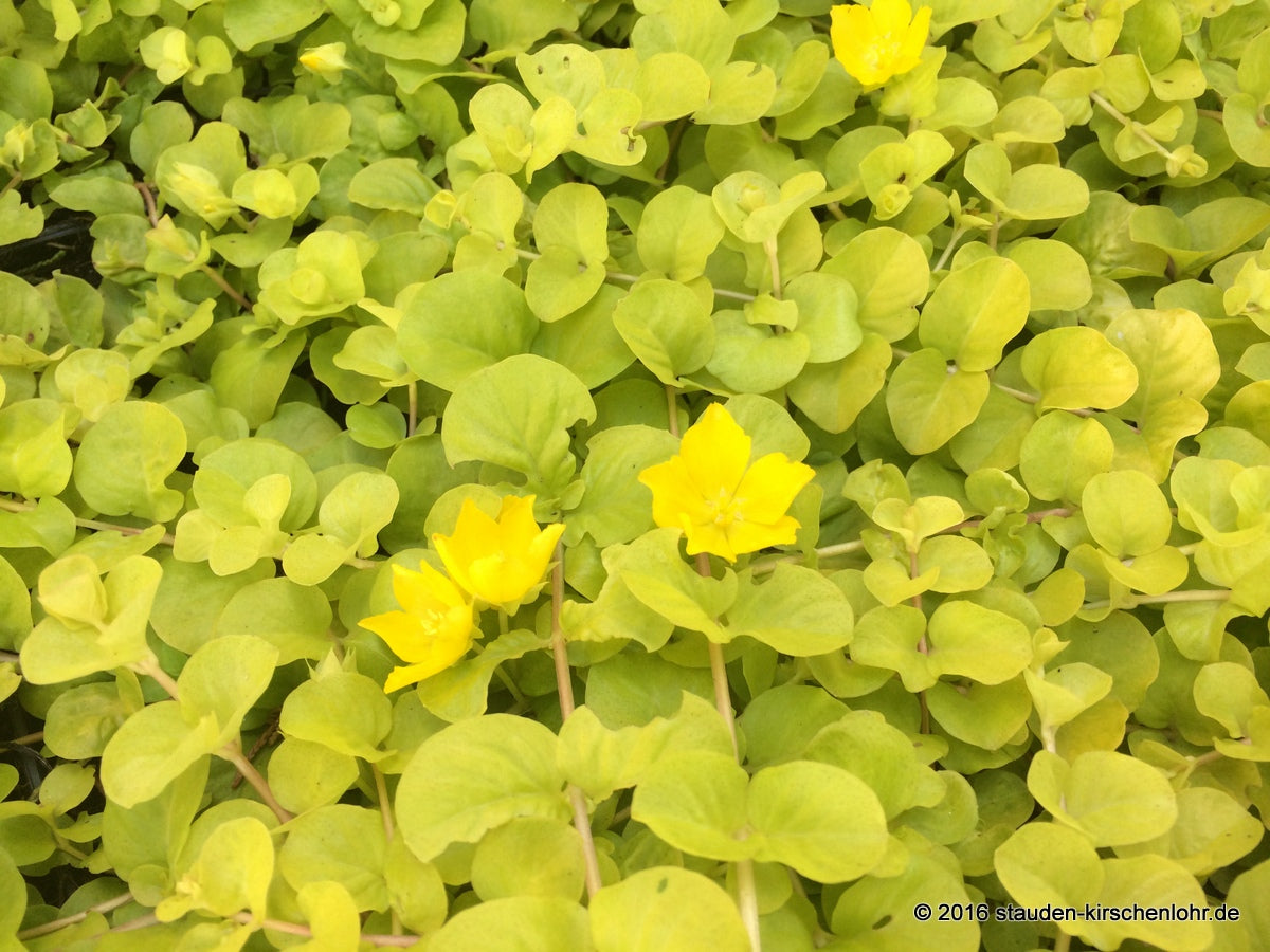 Leuchtend gelbe Blüten einzeln oder zu mehreren, erscheinen gestielt aus den Blattachseln. Gelbgrüne, rundlich ovale Blätter an niederliegenden Trieben. Teilweise wintergrüner Flächendecker.