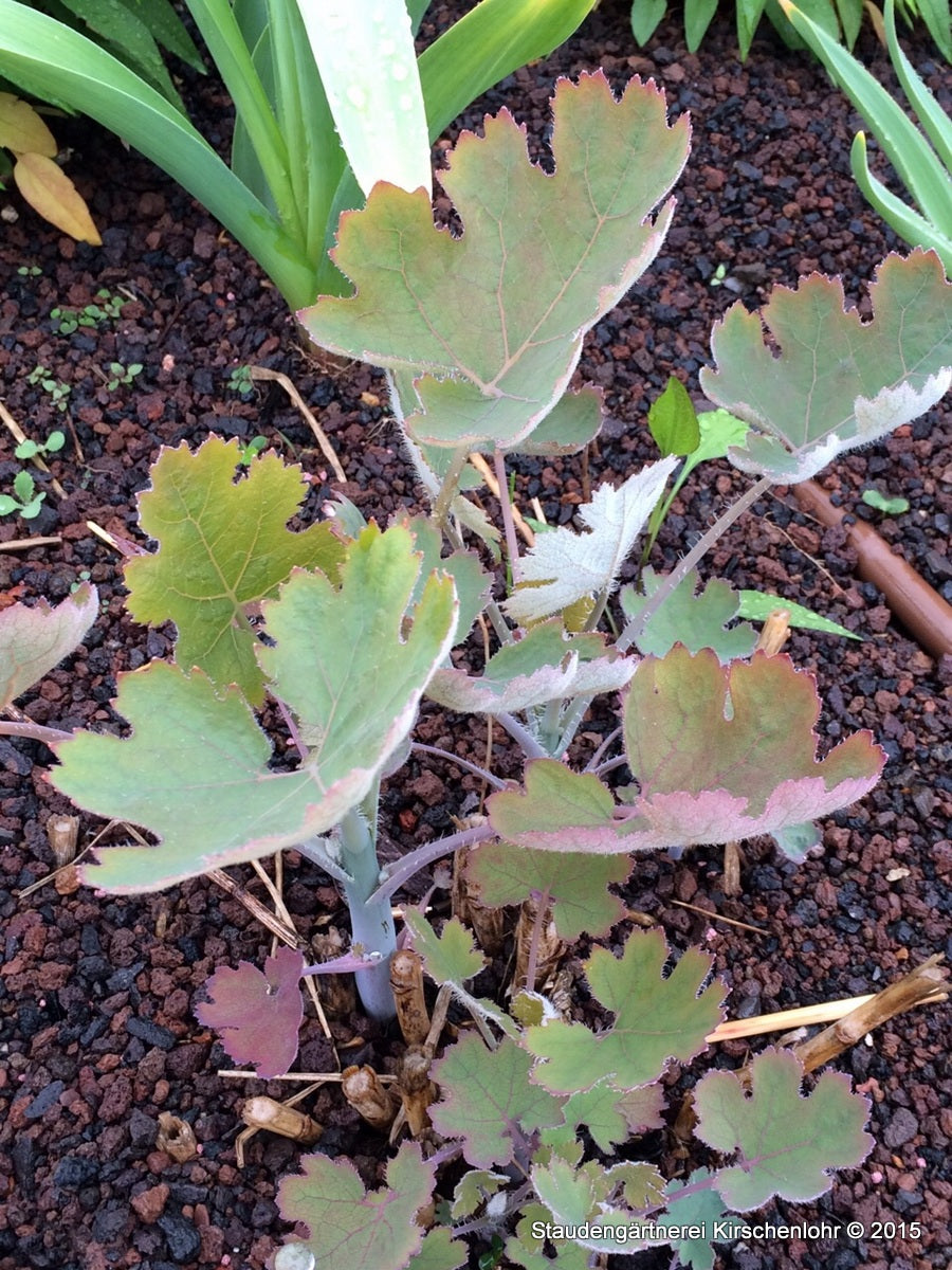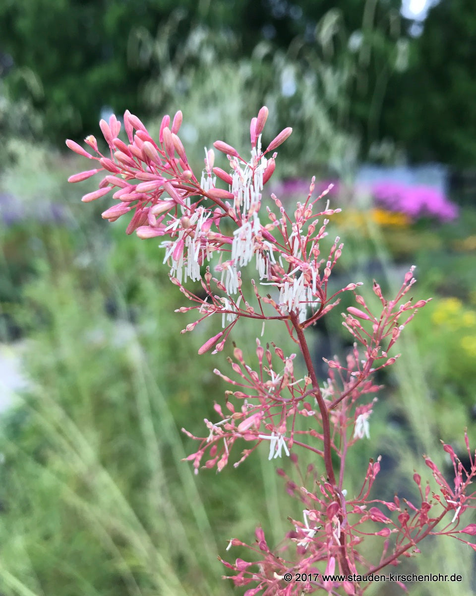 Rosa Blüten in locker bis straff aufrechten Rispen. Im Abblühen leuchtend rostrot. Große, graugrüne, gebuchtete Blätter. Sehr imposante Großstaude. Sommergün.
