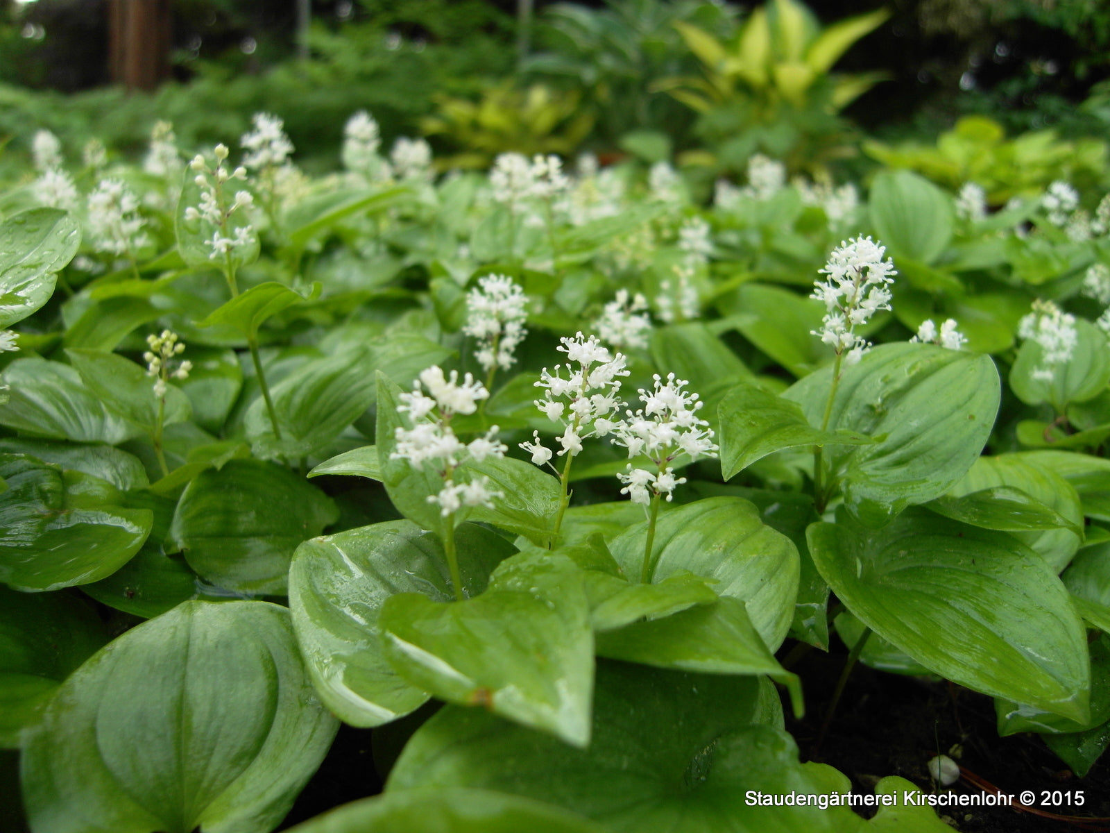 Weiße Blüten in einem aufrechten traubigen Blütenstand. Herzformige, dunkelgrüne, parallelnervige Blätter. Sommergrün. Breitet sich durch Rhizome aus.