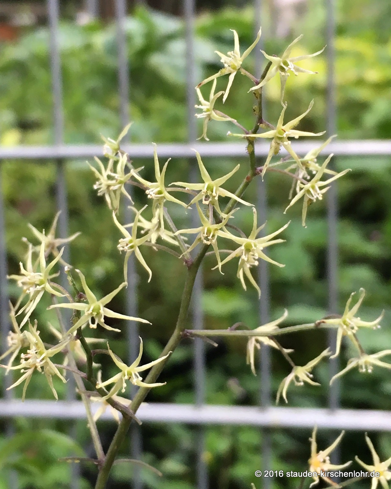 Hellgrüne, sternförmige Blüten in endständigen, lockeren Blütentrauben. Bogig überhängende Triebe mit seitwärts, schmalen, spitzlanzettlichen Blättern. Sommergün. syn. Smilacina tatsienense