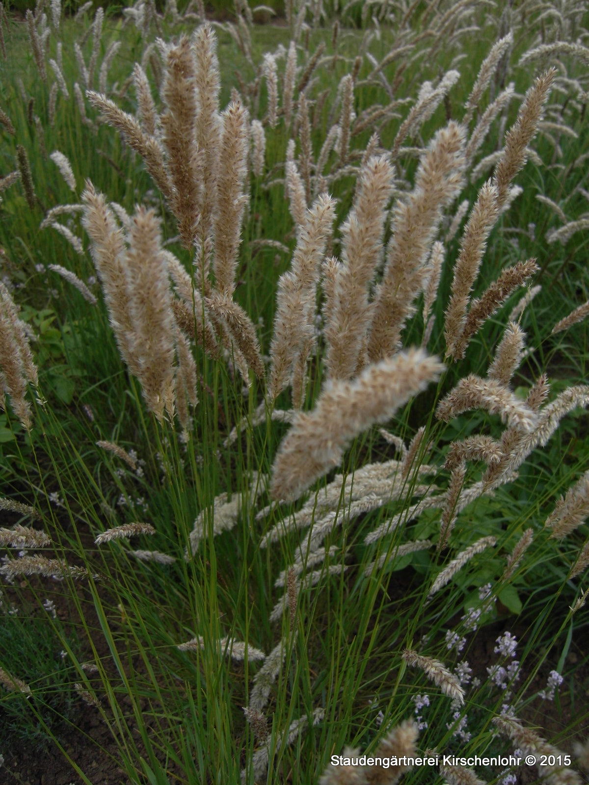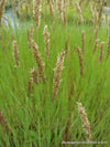 Zylindrische, cremeweiße bis blassgelbe, bogig überhängende, scheinährige Rispe. Graugrünes, nadeliges Laub. Sommergün.
