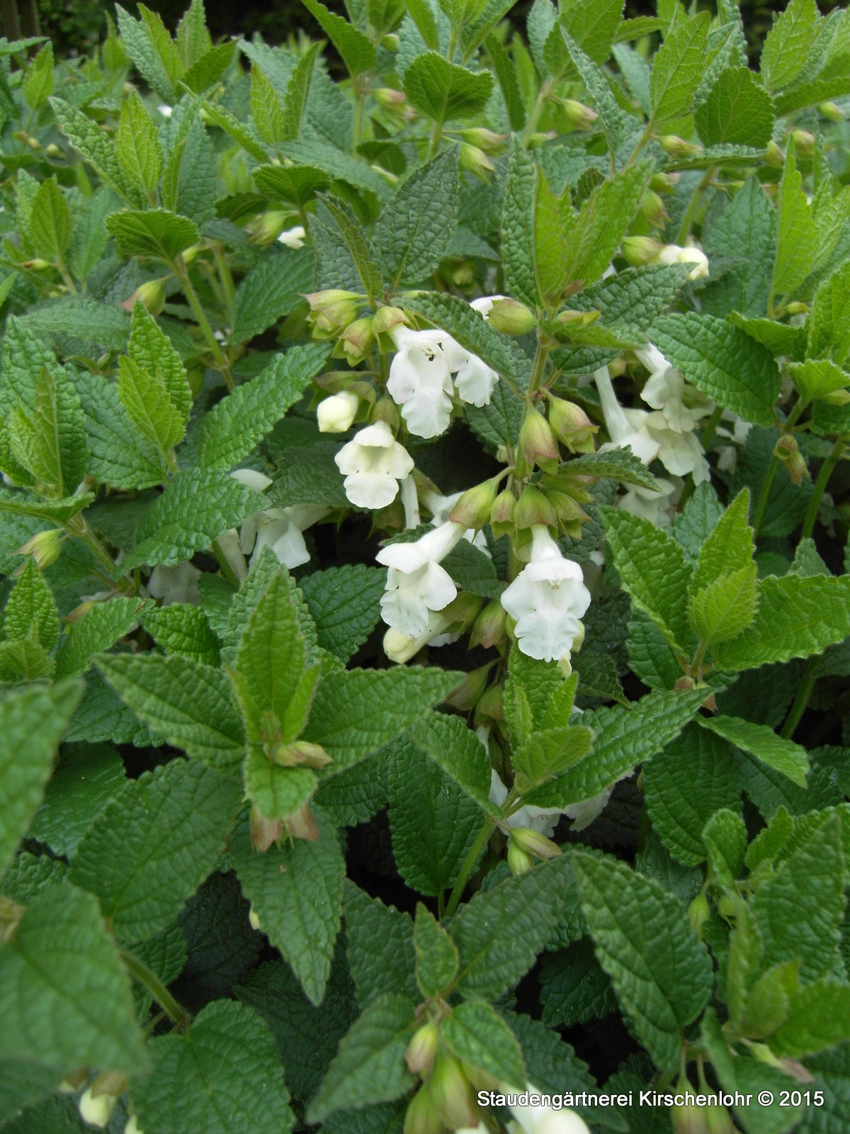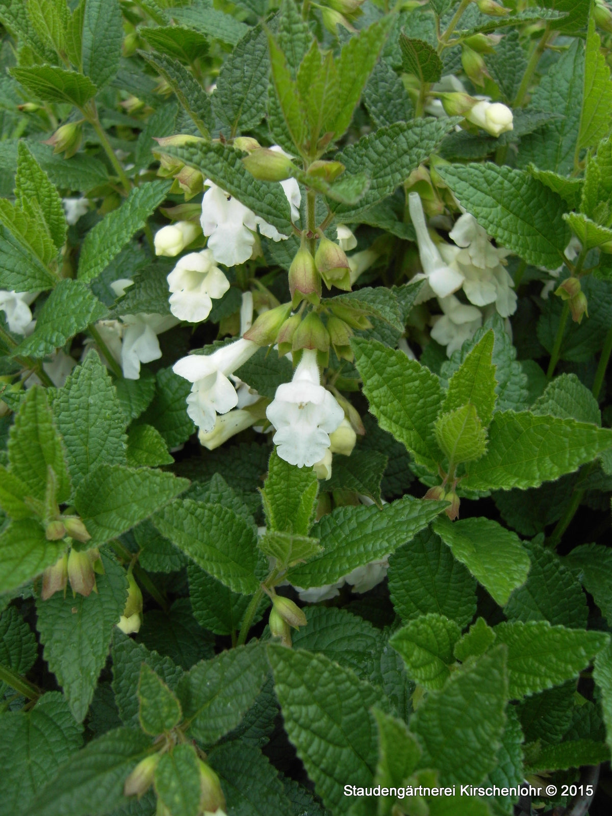 Komplett weiße Blüten. Wertvoller, kompakter Klon. Ovale Blätter mit gesägtem Blattrand. Für warme, humose auch steinige oder lehmige Böden.