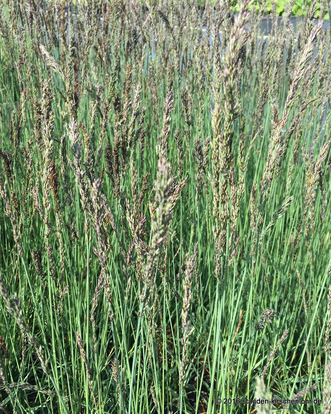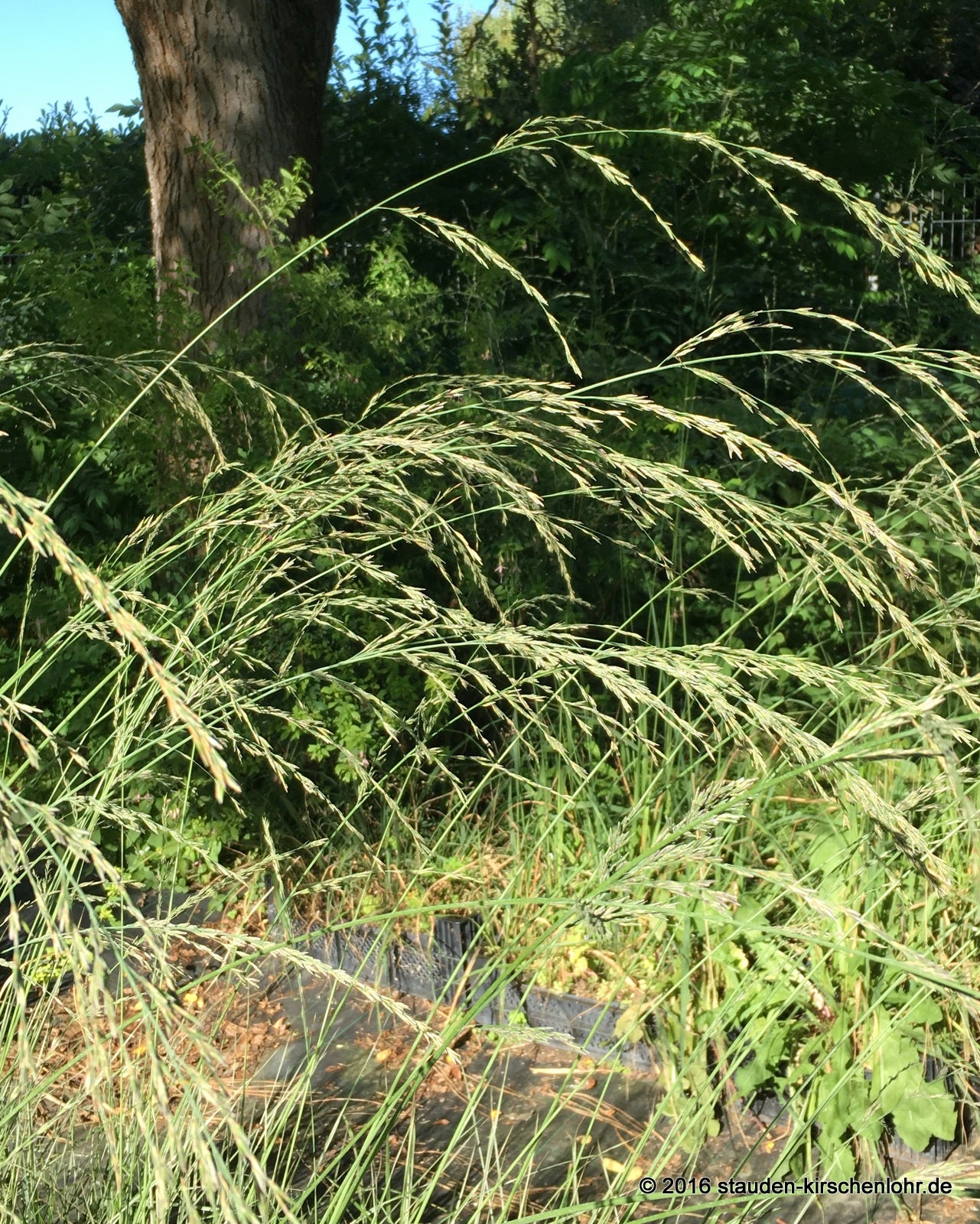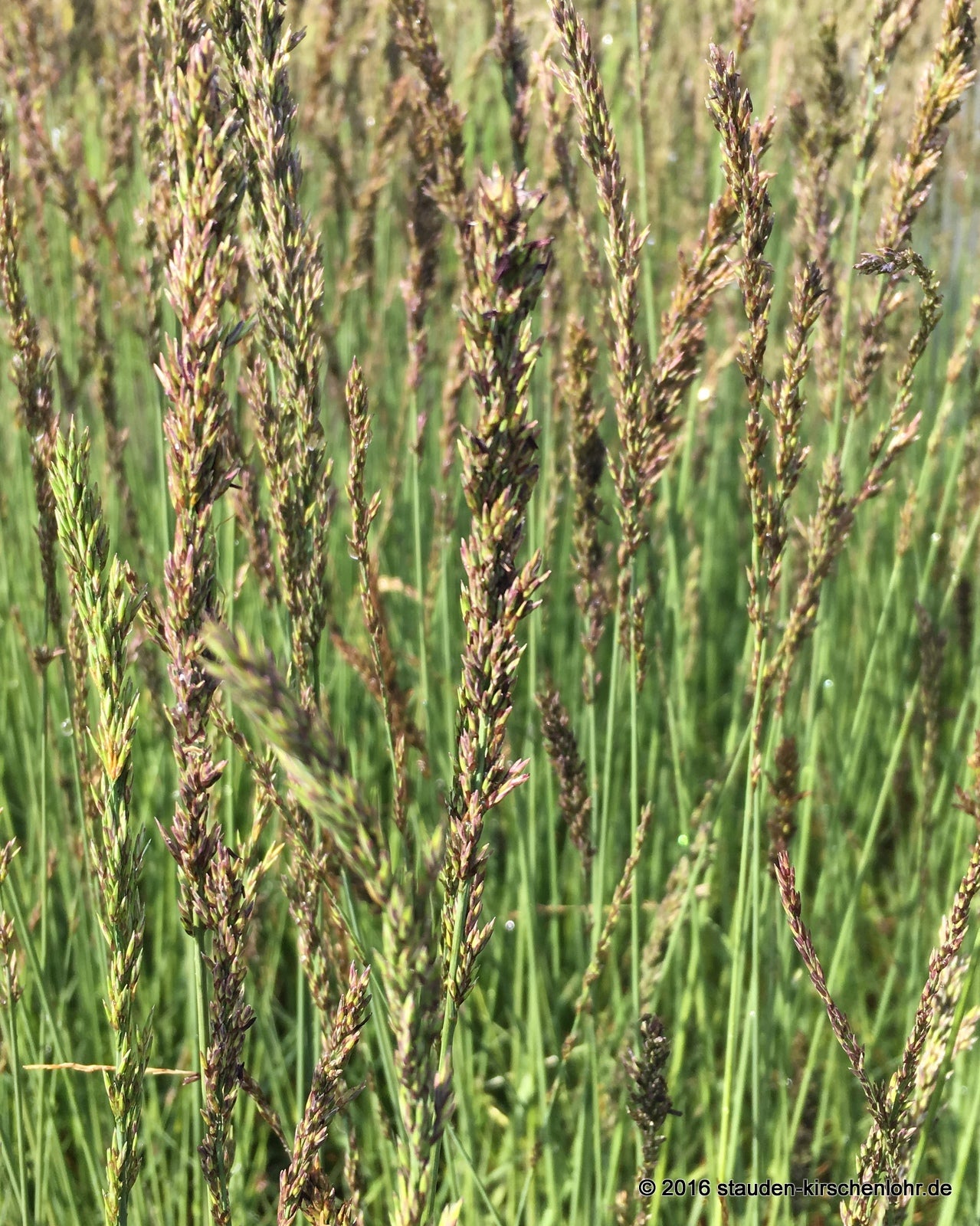 Braune Blütenrispen mit abstehenden Seitenästen. Die Halme stehen schräg aufwärts. Schöne leuchtend gelbe Herbstfärbung. Lineales Laub. Sommergün.