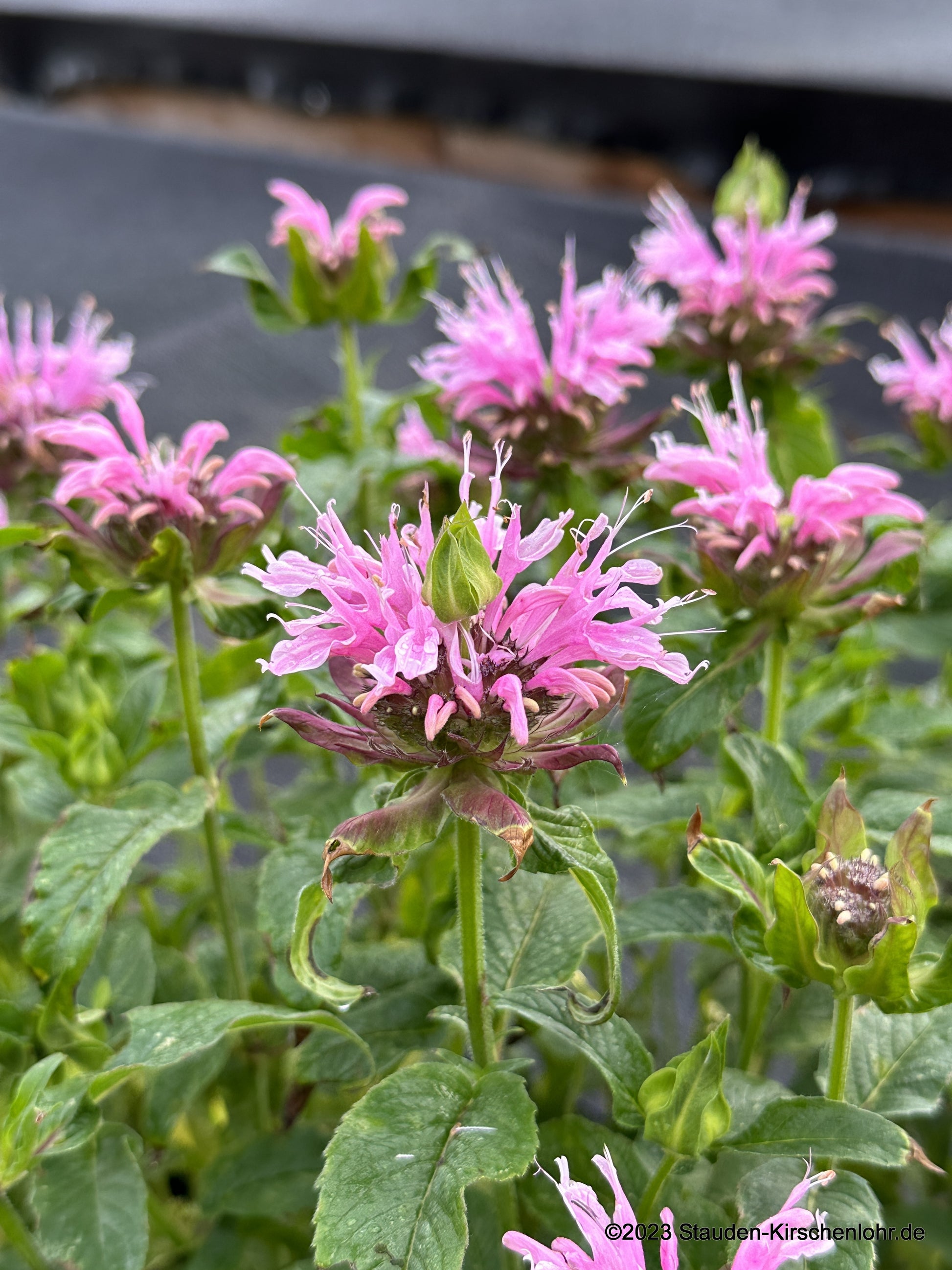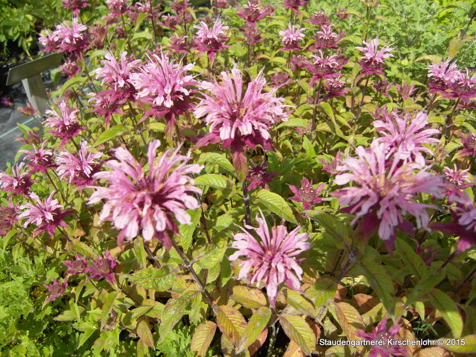 Purpurrosa Lippenblüten, etagen- bis quirlartig angeordnet. Blütenstand über violetten Hochblättern. Breitlanzettliche Blätter mit gesägtem Blattrand. Sommergün.