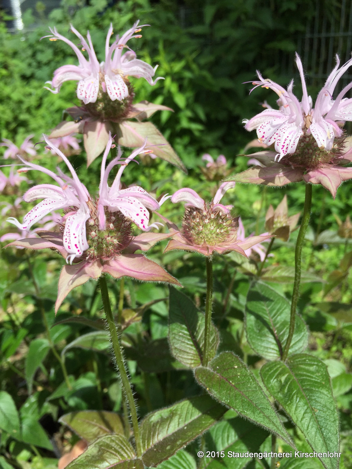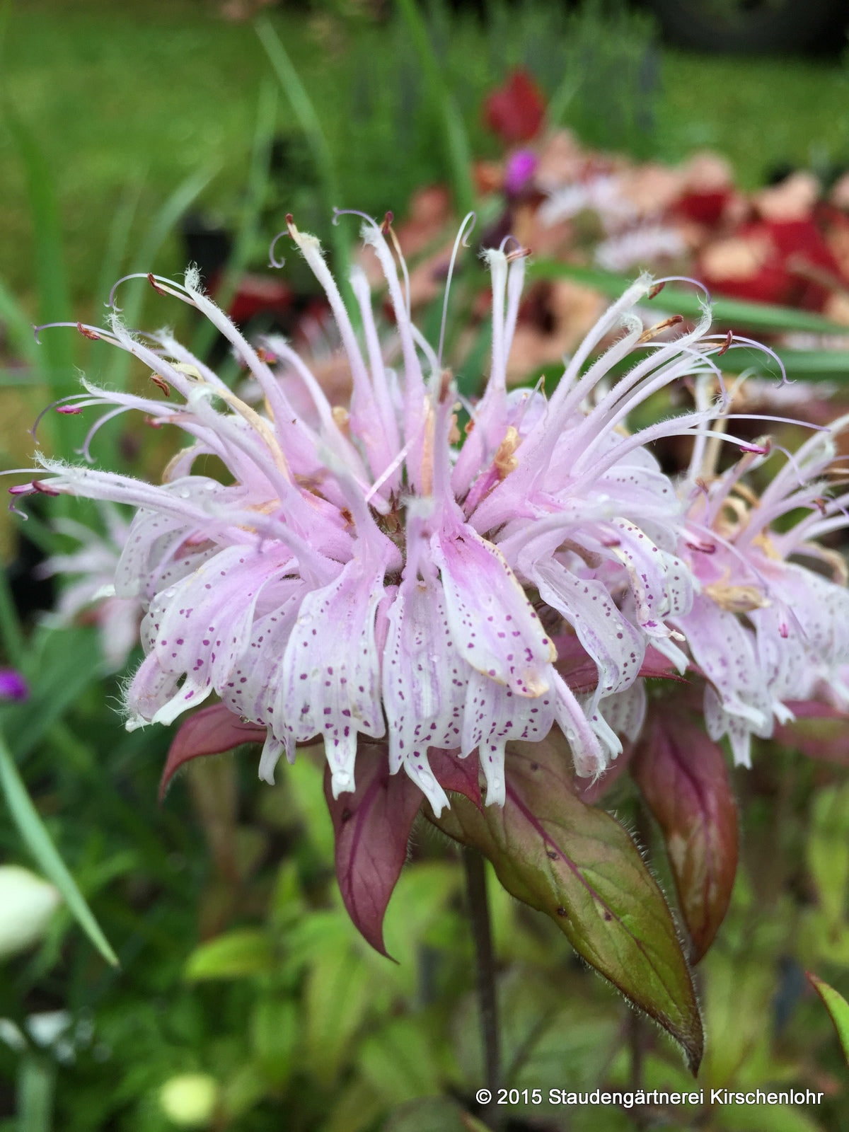 Hellrosa Lippenblüten mit traumhafter, weinroter Zeichnung. Qurlartigartig angeordnet. Breitlanzettliche Blätter mit gesägtem Blattrand. Schokoladenfarbener Austrieb.