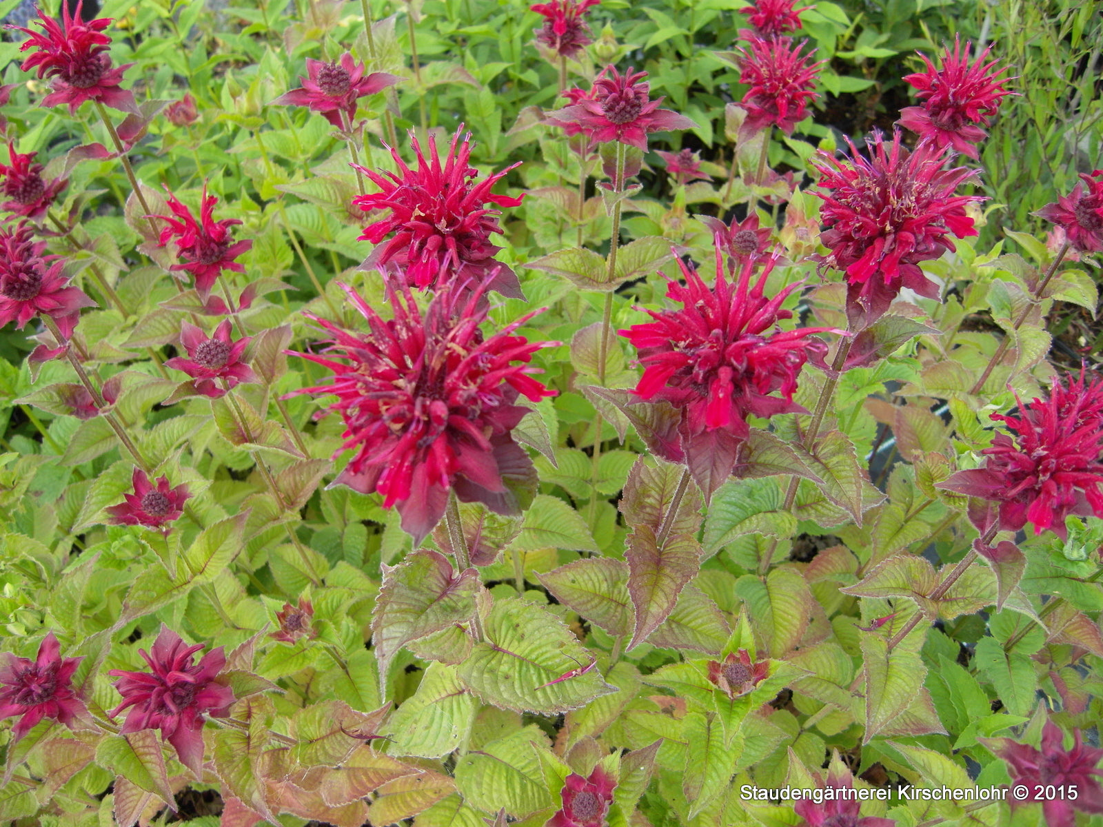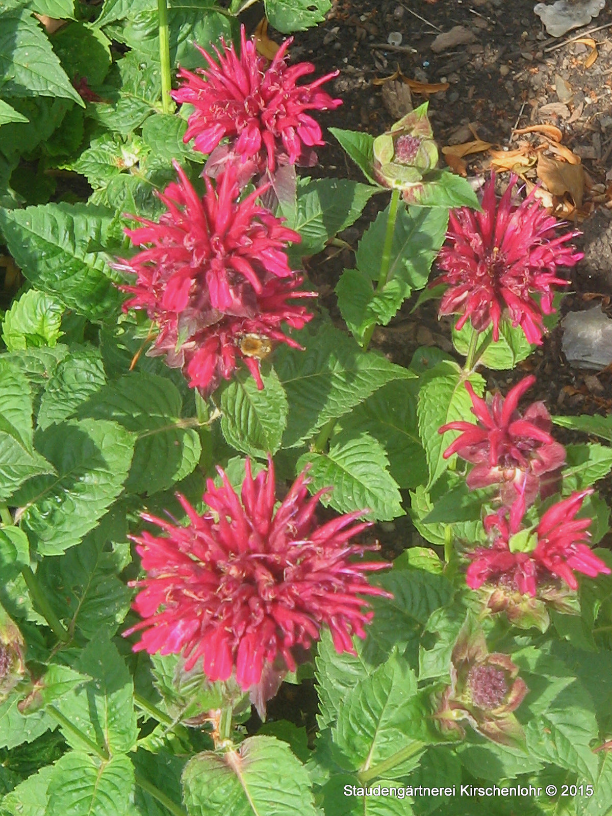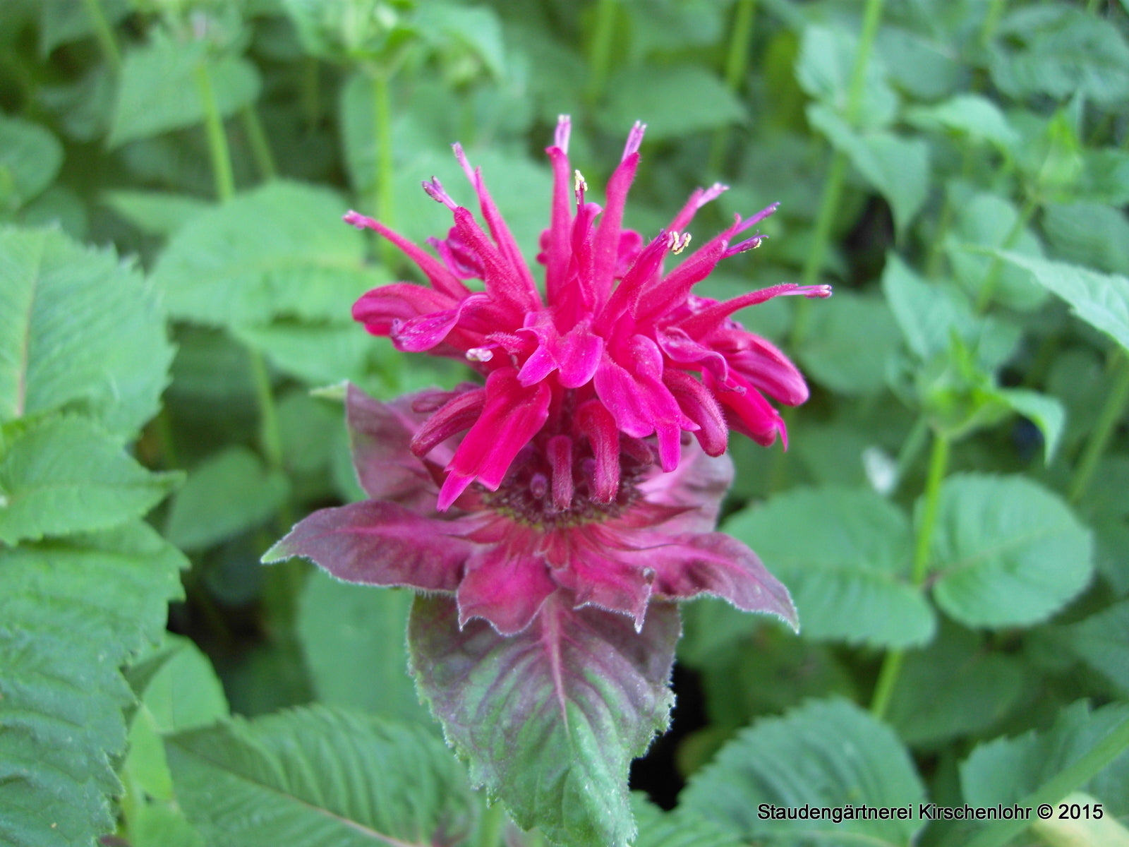 Purpurrote Lippenblüten, etagen- bis quirlartig angeordnet. Blütenstand über rotbraunen Hochblättern. Breitlanzettliche Blätter mit gesägtem Blattrand. Sommergün.