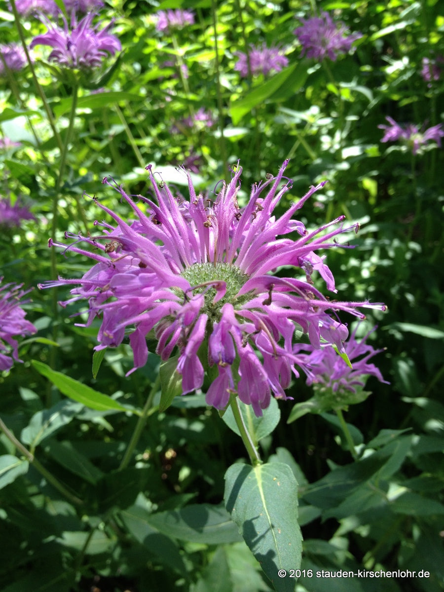 Hellviolette Lippenblüten, etagen- bis quirlartig angeordnet. Breitlanzettliche Blätter mit gesägtem Blattrand. Kompakte Selektion der Minzeblättrige Varietät. Kaum mehltauanfällig. Sommergün.